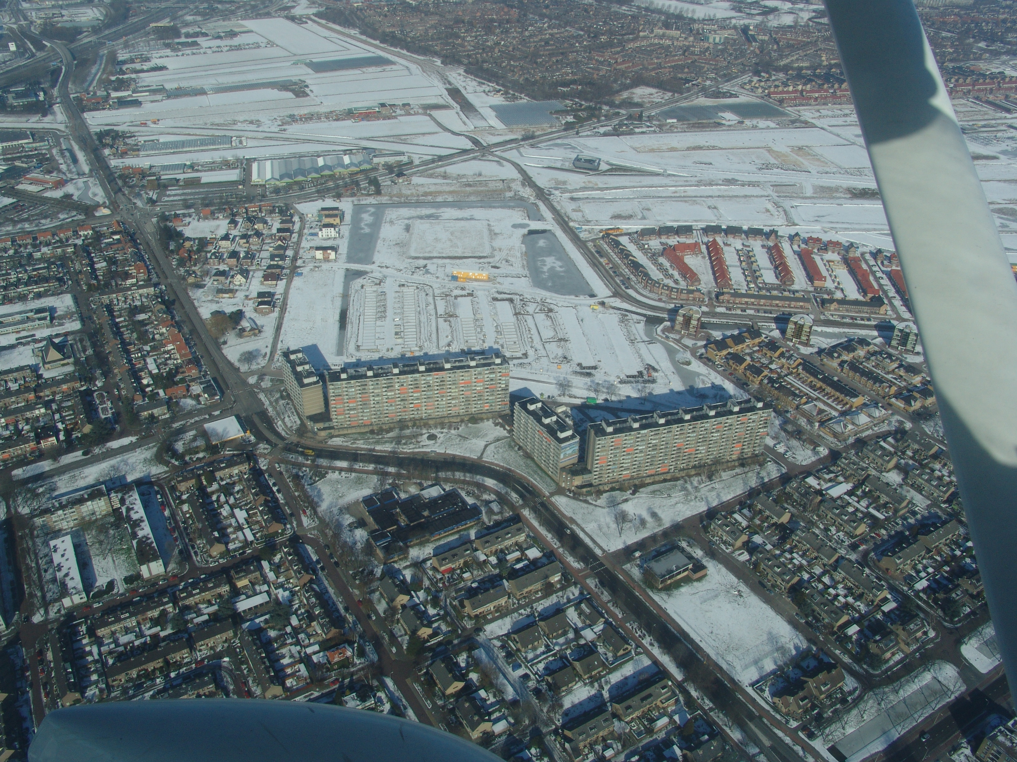 - Luchtfoto van Zwijndrecht (linksonder) en Hendrik-Ido-Ambacht gescheiden door Swanendrift en Langeweg.