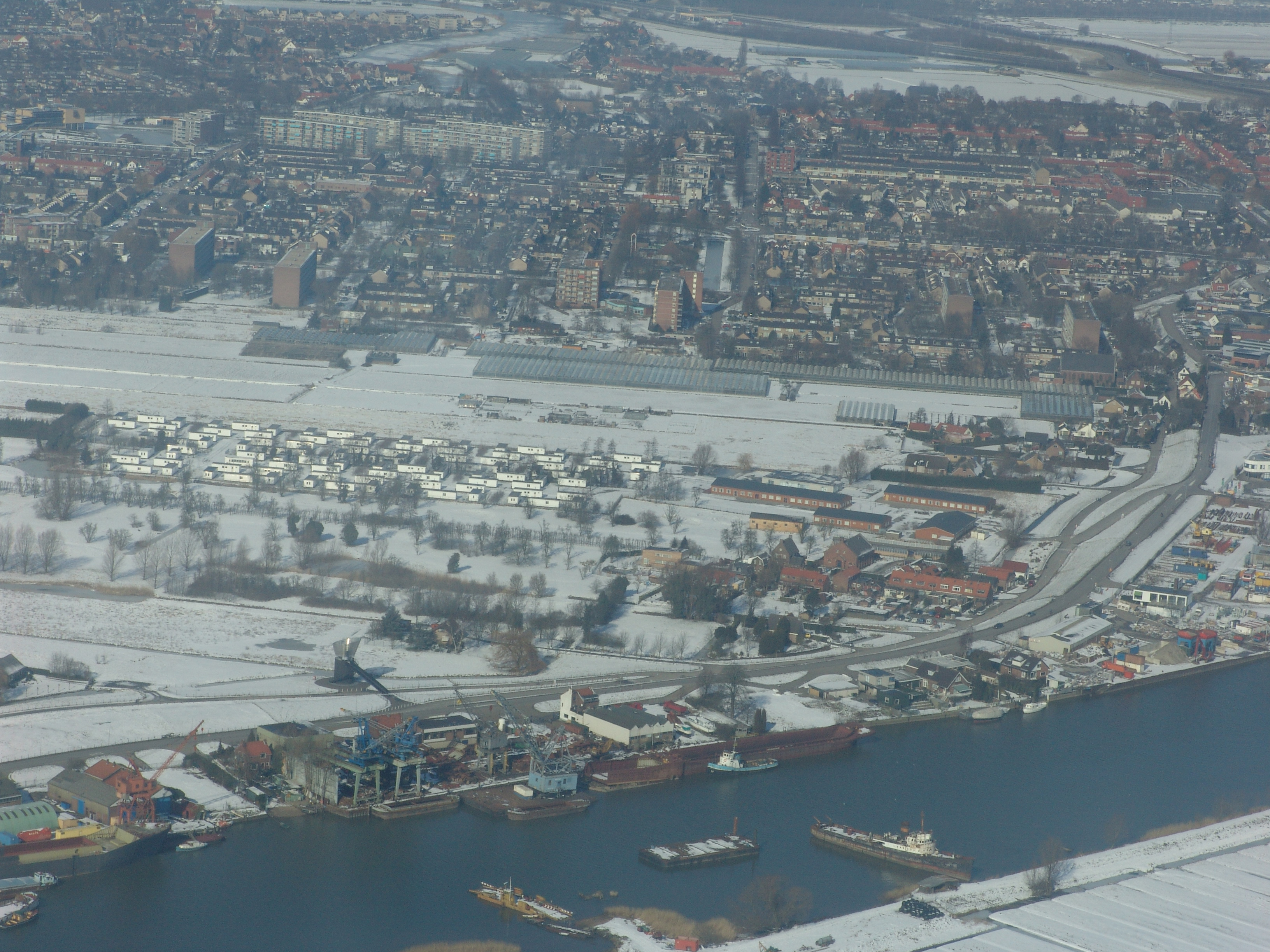 - Luchtfoto van Hendrik-Ido-Ambacht. In het midden de cabines van het asielzoekerscentrum. Onderin deSophiapolder en het water de Rietbaan. V.l.n.r. loopt de Veersedijk.