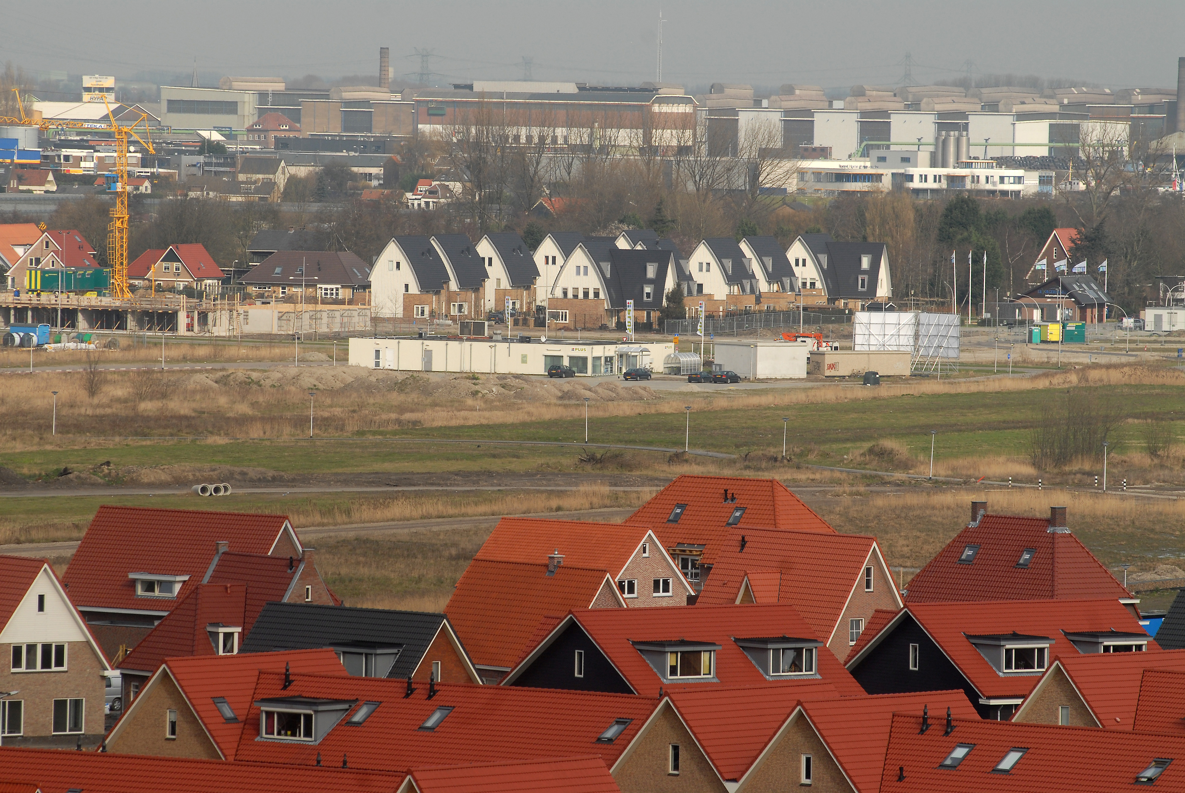 - Op de voorgrond De Hooge Donck in Hendrik-Ido-Ambacht. Daarachter woningen met donkere daken aan het Perenlaantje. Op de achtergrond de staalfabriek in Alblasserdam.