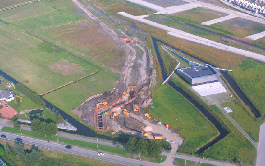 - Luchtfoto van Hendrik-Ido-Ambacht vanaf de Ambachtsezoom met het dienstgebouw van de Sophia spoortunnel in de richting van Laagveen en Hooftlaantje.