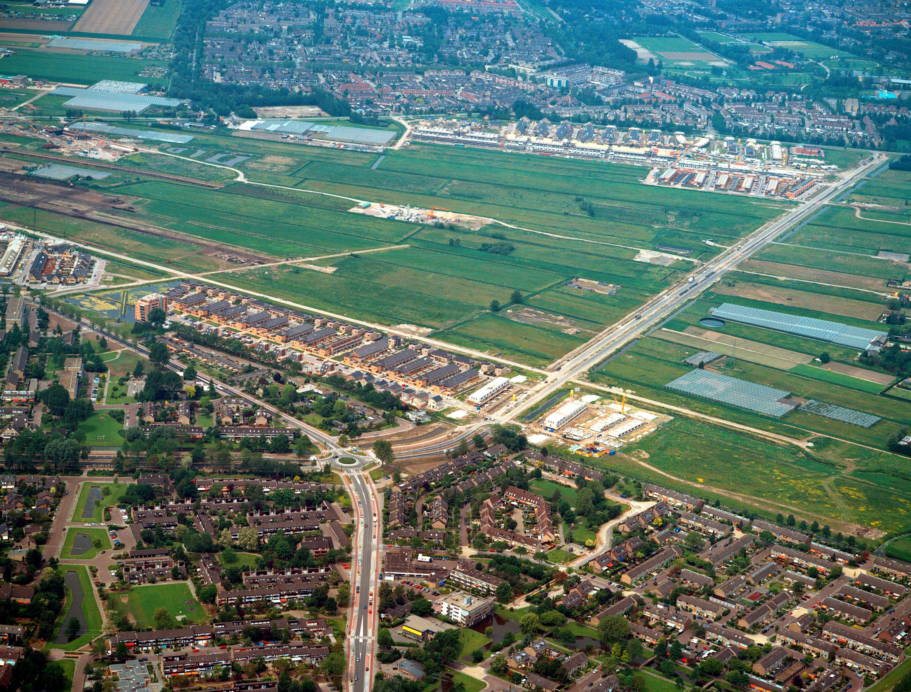 Luchtfoto van Zwijndrecht en Hendrik-Ido-Ambacht (boven). Middenonder de Thorbeckelaan, bij de rotonde naar rechts de Laan van Welhorst en Hoofdland naar links.