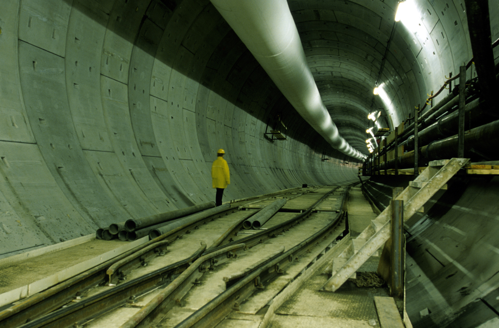 Bouw van de geboorde Sophiaspoortunnel onder de Noord voor goederenvervoer: de Betuwelijn.