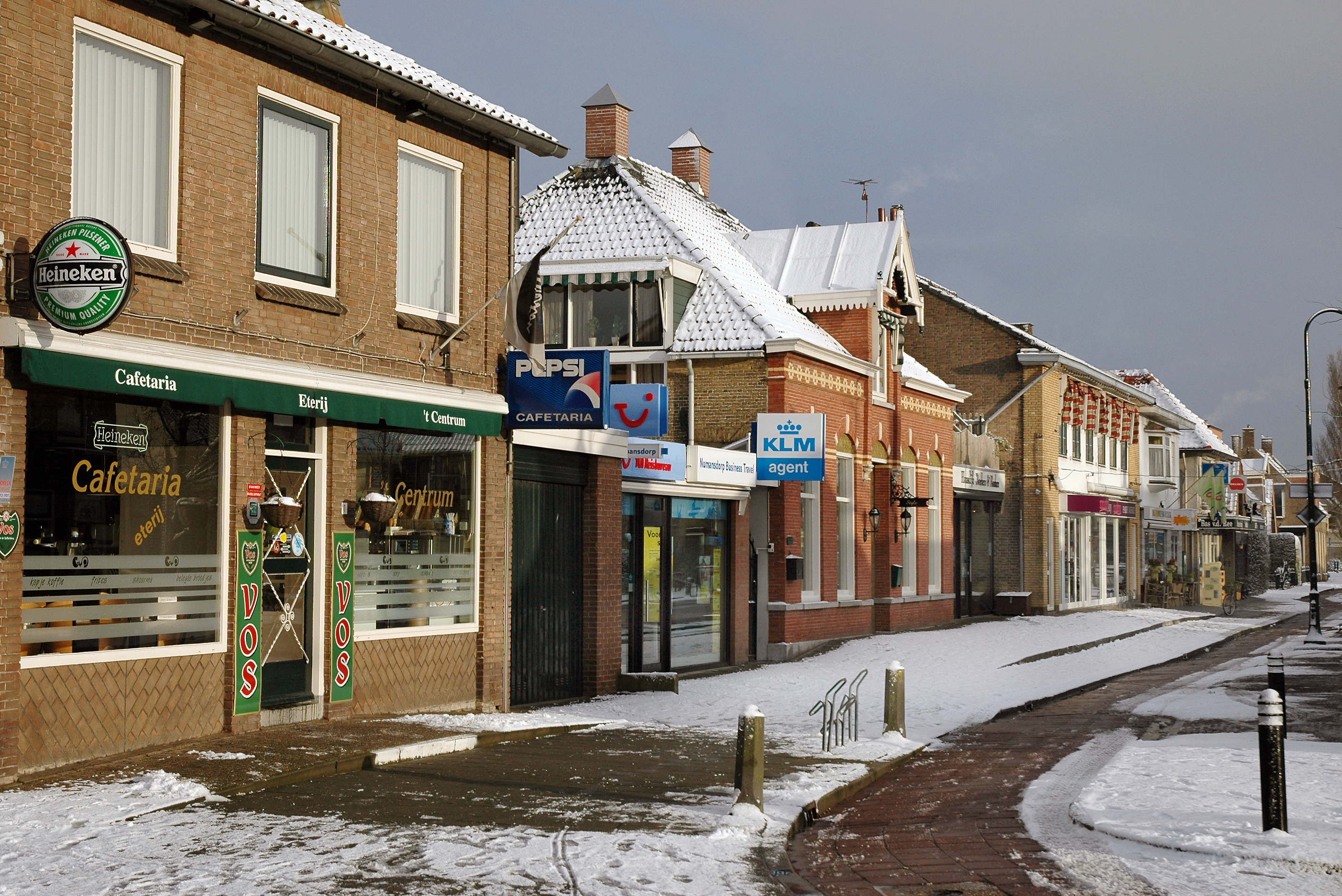 Burg.de Zeeuwstraat met links cafetaria t'Çentrum op nummer 1 gezien in de richting van de Vlielanderstraat in Numansdorp.