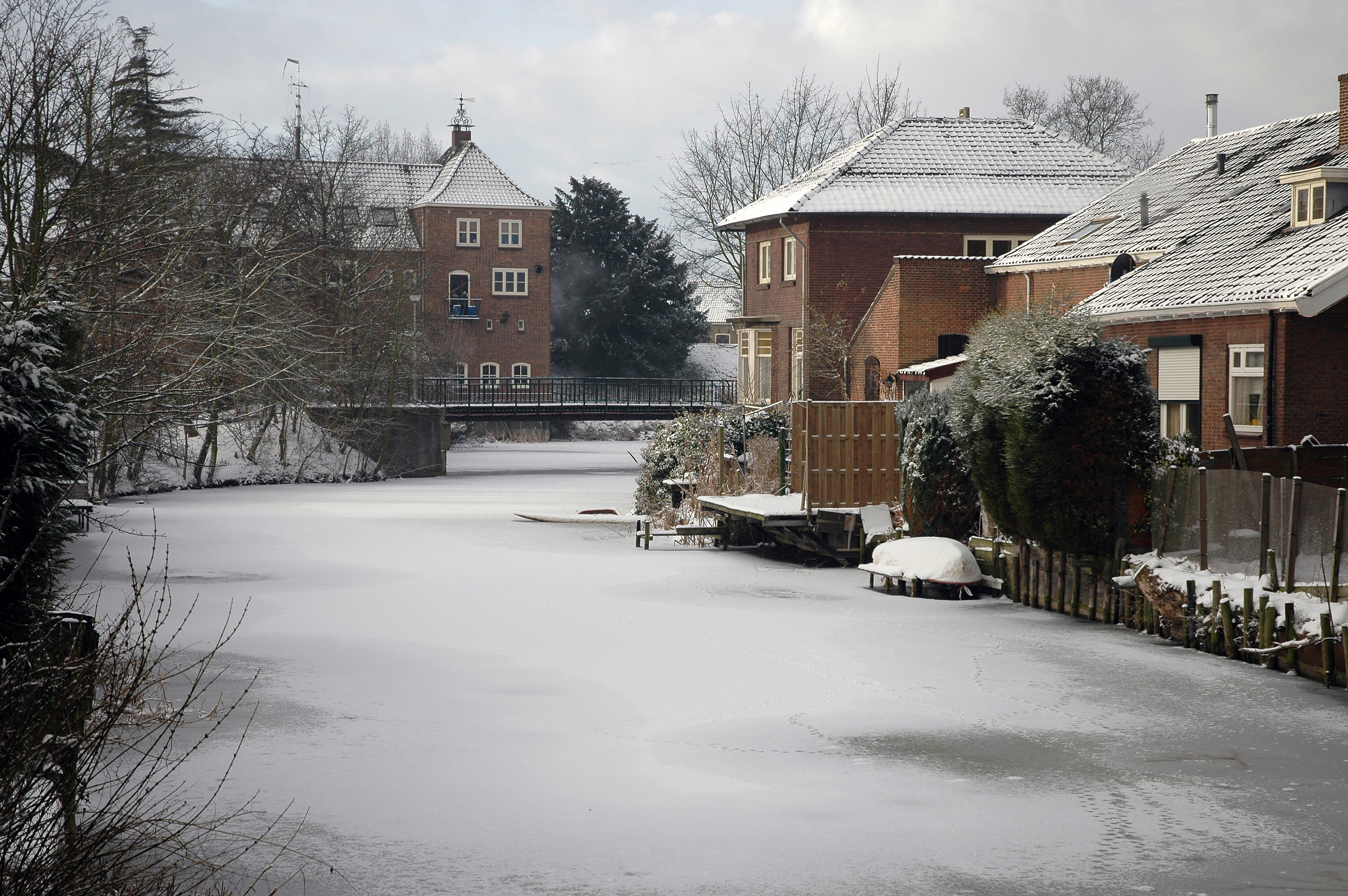 - De Binnenhaven vanaf de Heulbrug tussen de Havenstraat (rechts) en de Voorstraat in Numansdorp, met zicht op het Schippershuis aan de Molendijk.