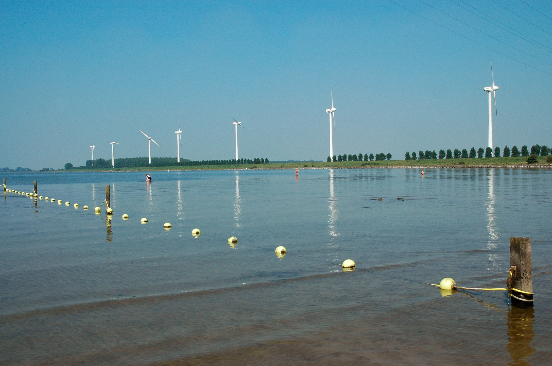 - Windturbines bij het strandje aan de westzijde van de Haringvlietbrug bij Numansdorp.