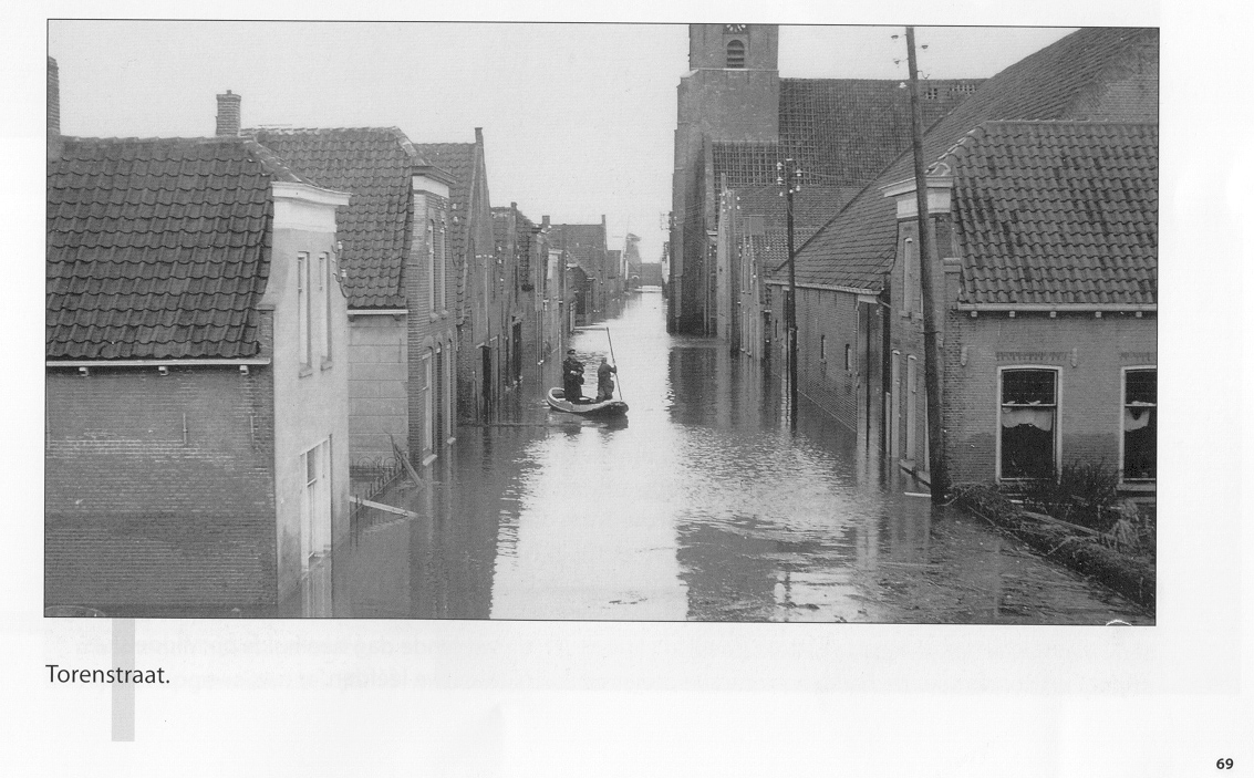 De Torenstraat met de kerk van de Hervormde Gemeente in Numansdorp tijdens de watersnood.