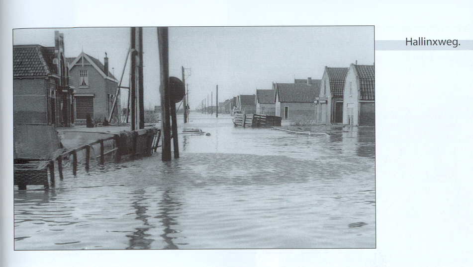 - De Hallinxweg in Numansdorp tijdens de watersnood gezien naar het westen vanaf de brug over de Binnenhaven.