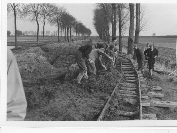 Arbeiders tijdens de watersnood in Numansdorp.