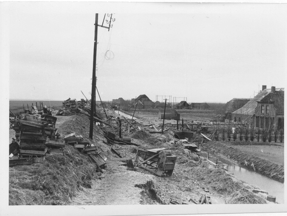 Aangetaste dijk na de stormvloed van 1953 in Cromstrijen