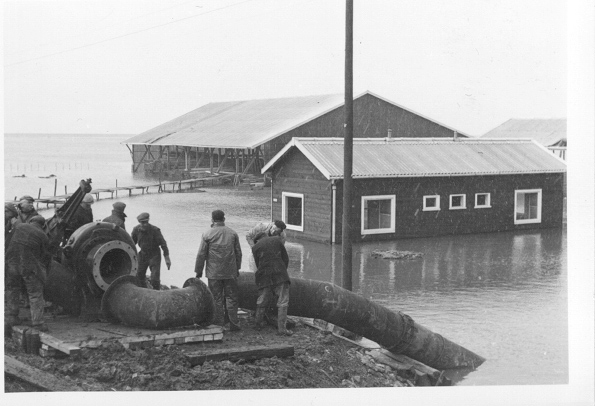 Installatie waterpomp tijdens de watersnood van 1953 Cromstrijen.