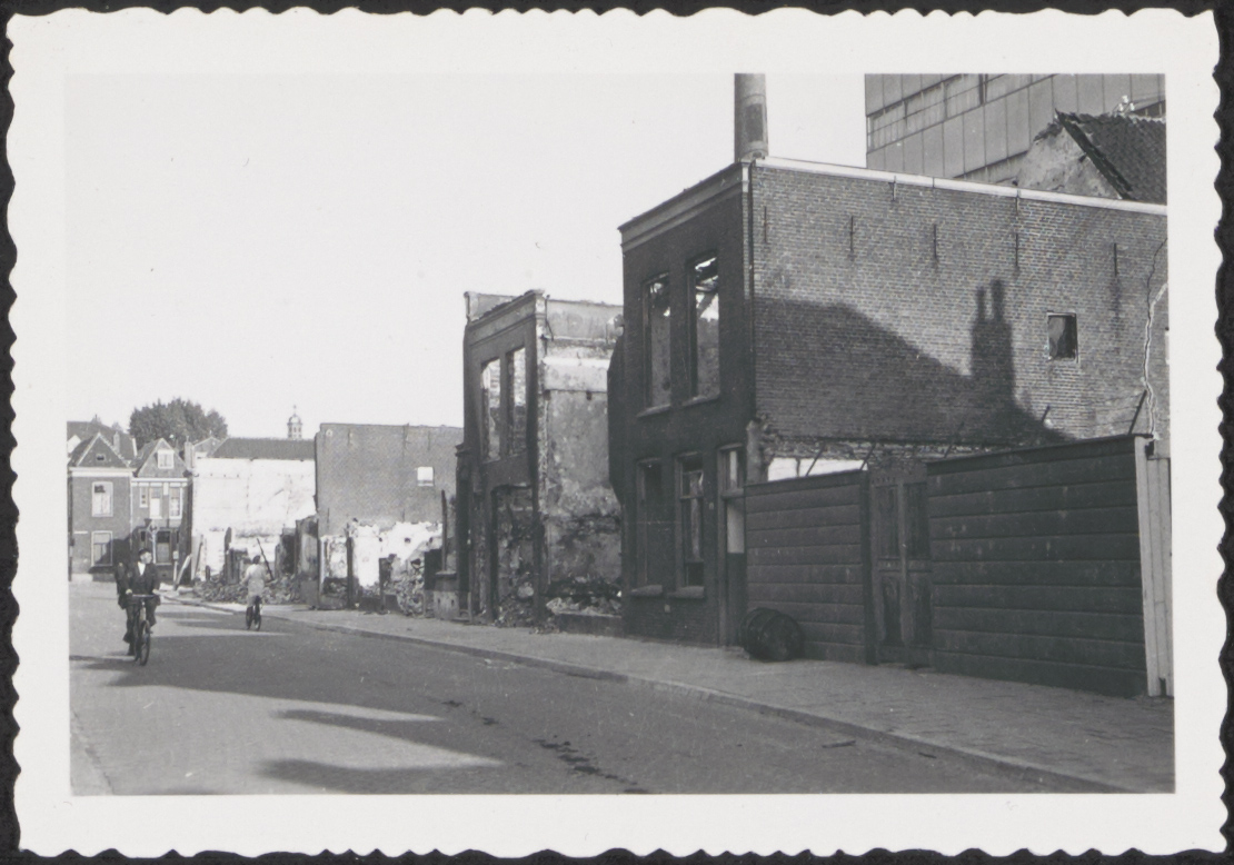 Door kanonvuur vernielde panden aan de Twintighuizen in mei 1940, gezien richting Van …