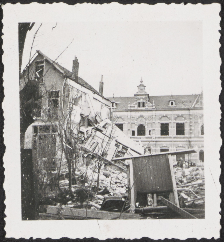 Vernielde huizen aan de Sint Jorisweg tegenover schouwburg Kunstmin bij het bombardement op park Merwestein..