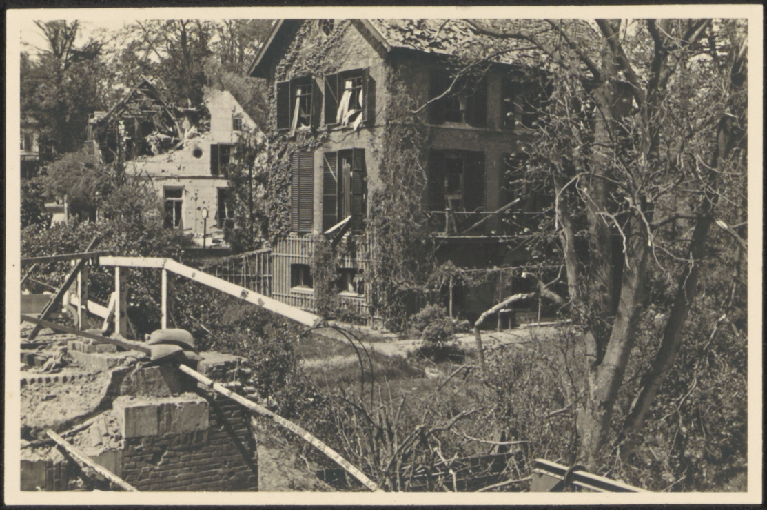 Zie ook 1183_1014 en 1183_1147: kapotgeschoten huis met op de voorgrond een deel van de Grebbesluis aan de voet van de Grebbeberg in Rhenen.