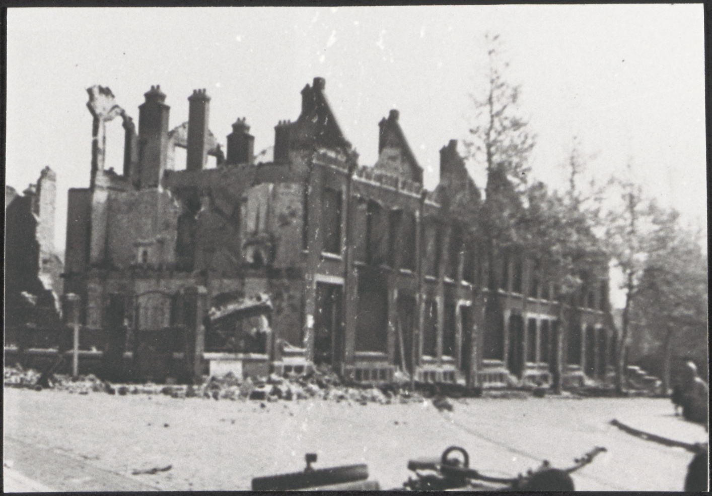 - Door beschietingen in mei 1940 beschadigde bebouwing in de Hoge Bakstraat hoek Havenstraat (rechts), gezien vanaf de Korte Parallelweg.