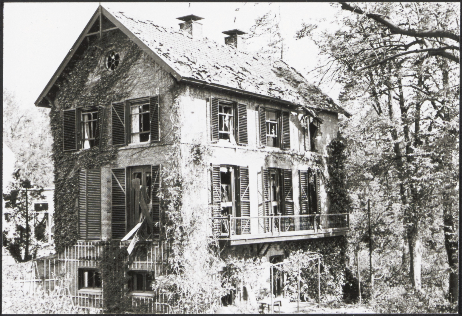 Oorlogsschade aan de naast de Grebbesluis gelegen bebouwing aan de voet van de Grebbeberg in Rhenen.