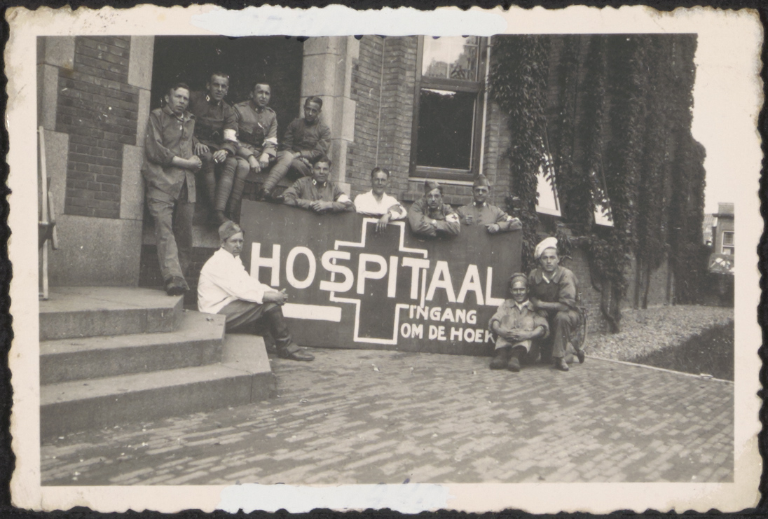 - Een groep Rode Kruissoldaten bij de ingang van de ambachtsschool dat toen als hospitaal dienst deed aan de Reeweg Oost.