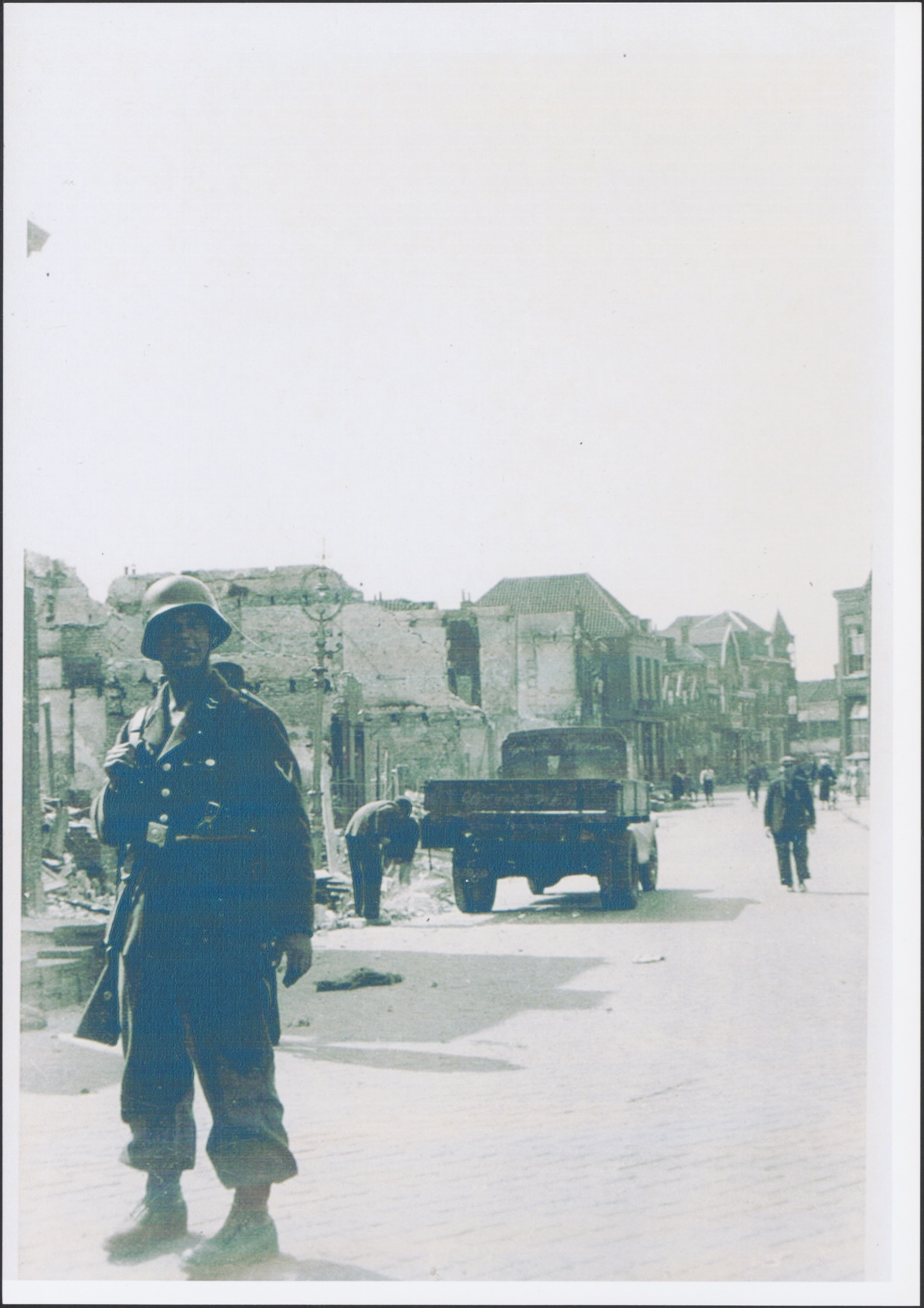 Oorlogsschade mei 1940. Twintighuizen richting Wilgenbos.Uiterst rechts het voormalige woonhuis van de scheepsbouwer J. Schouten.