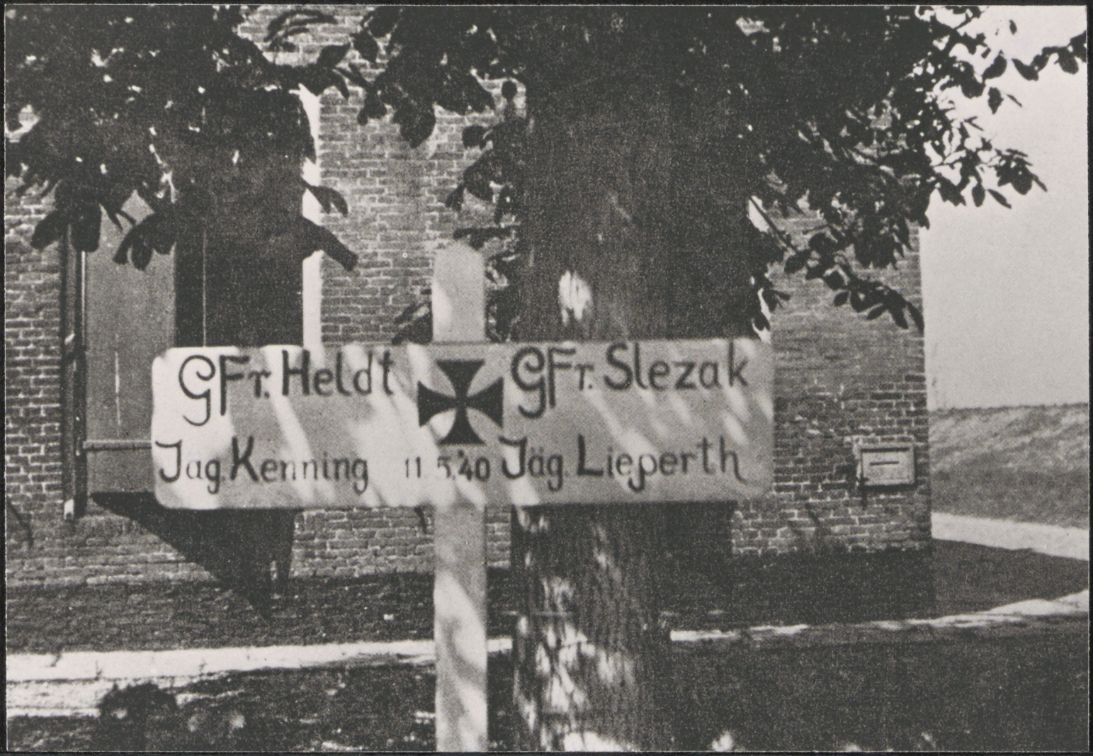 Deze foto is mogelijk genomen bij de oude hoeve op de Tongplaat. In de meidagen van 1940 heeft een groep Duitse Fallschirmjäger hier een tijdelijk noodhospitaal ingericht. De vier op het kruis genoemde soldaten zijn in de directe omgeving gesneuveld en liggen nu begraven op de Duitse begraafplaats te Ysselsteyn.