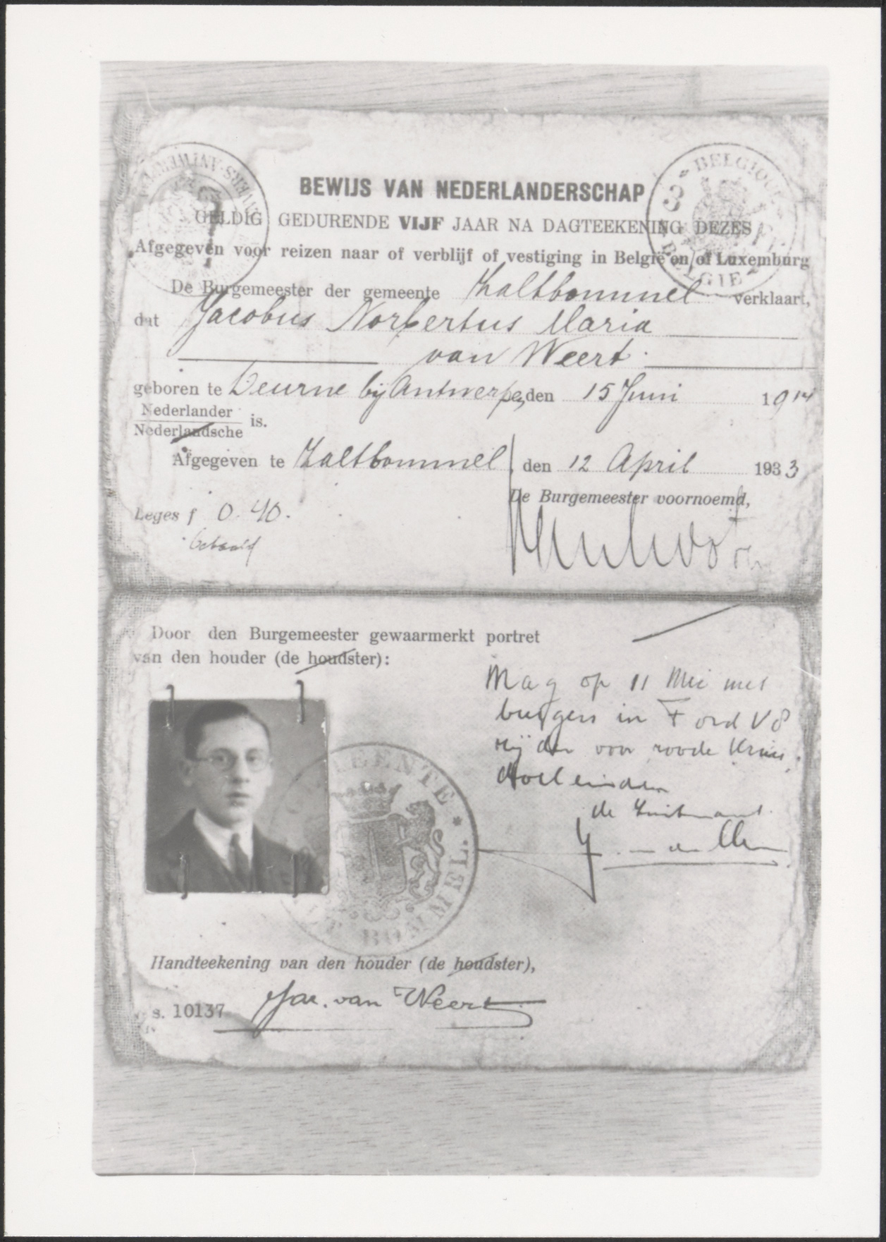 bewijs van Nederlanderschap -- Jacobus Norbertus Maria van Weert, geboren Deurne bij Antwerpen 15 juni 1914, afgegeven Zaltbommel 12 april 1933 (mag met burgers in Ford V8 rijden voor roode Kruis doeleinden, de Luitenant)(met pasfoto)
