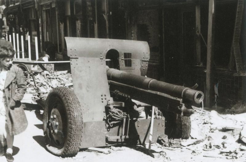 Het Nederlandse 7 veld geschut van Wachtmeester Kruithof van het Korps Rijdende Artillerie. Het had een vuurduel met meerdere Duitse tanks bij de Vriesestraat /Vriesebrug op 13 mei 1940. Het had op enig moment een treffer te verduren. Soldaat Burgers en van den Akker sneuvelden. Wachtmeester Kruithof en Eijckelenberg raakten ernstig gewond. Op deze foto is de voltreffer op de loop goed te zien. Meidagen 1940 zie foto 1183_2143