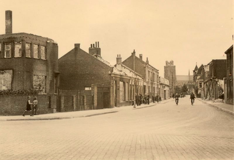 Het kruispunt Dokweg en Wilgenbosch. Links de vernielde wasserij Weltevrede. De gebouwen hier werden beschadigd tijdens de gevechten in mei 1940. Meidagen 1940