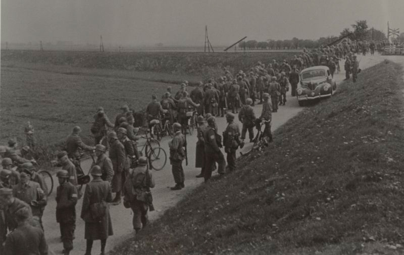 Duitse parachutisten en Nederlandse krijgsgevangen bij de Tweede Tol in Dubbeldam in mei 1940. De officier links in de hoek is Oberst Bruno Bräuer, commandant van Fallschirmjäger Regiment 1. Meidagen 1940. Zie foto 1183_2113