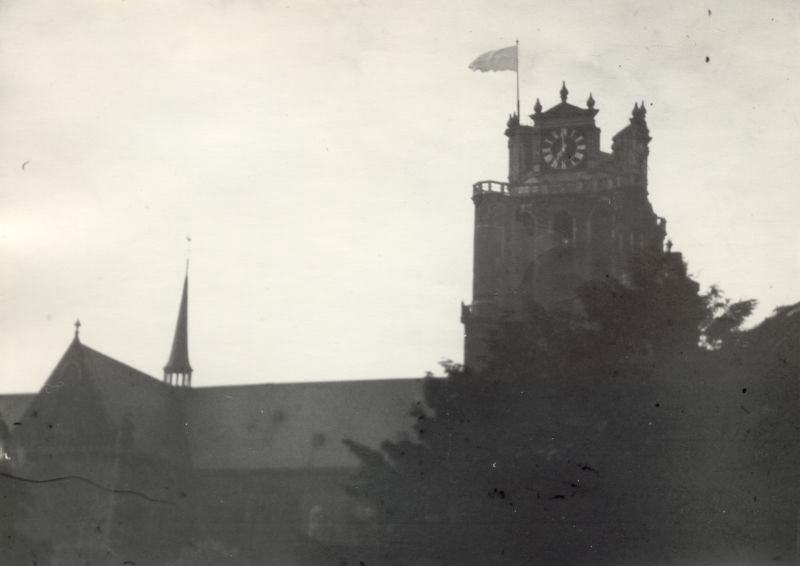 Een witte vlag boven de Grote Kerk in Dordrecht nadat de stad ontruimt was door het Nederlandse leger. Dit was het beeld op 14 mei 1940. Meidagen 1940 Zie foto 1183_2057