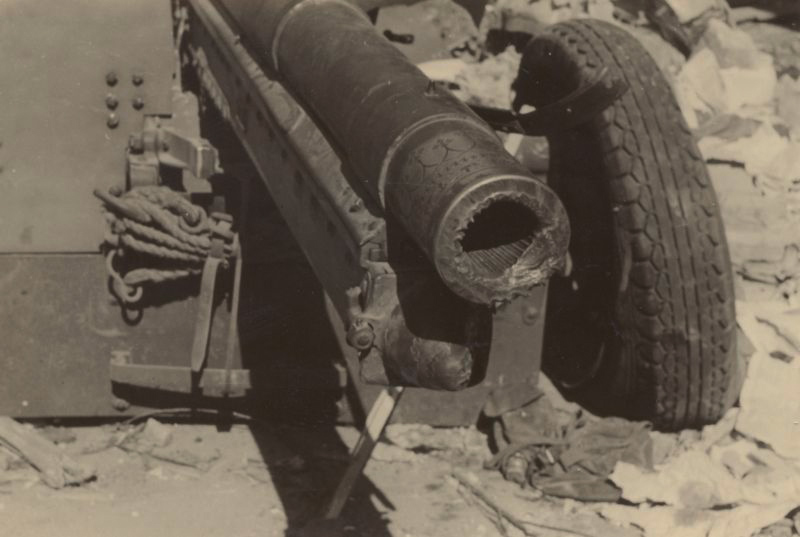 Het Nederlandse 7 veld geschut van Wachtmeester Kruithof van het Korps Rijdende Artillerie. Het had een vuurduel met meerdere Duitse tanks bij de Vriesestraat /Vriesebrug op 13 mei 1940. Het had op enig moment een treffer te verduren. Soldaat Burgers en van den Akker sneuvelden. Wachtmeester Kruithof en Eijckelenberg raakten ernstig gewond. Op deze foto is de voltreffer op de loop goed te zien. Meidagen 1940 zie foto 1183_2143