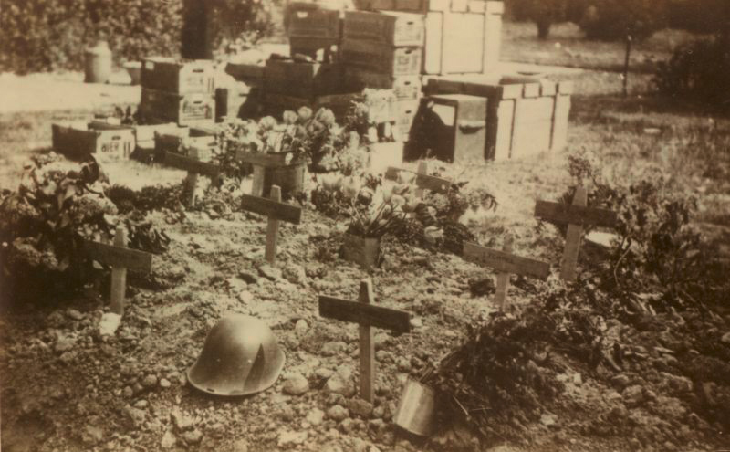 Nederlandse veldgraven in de tuin bij Amstelwijck na de gevechten daar op 10 mei 1940. Onder andere zien we het graf van Dienstplichtig Soldaat Jan Tempel van de staf I-17 R.A. die in zijn been werd geschoten en verzorgd werd door officier van gezondheid van Hattum. Toen de Duitsers met handgranaten gooiden sneuvelde de soldaat alsnog. Opvallend genoeg werd Jan Tempel begraven op de begraafplaats in Dubbeldam terwijl Petrus de Haan bijvoorbeeld weer werd begraven op de Algemene Begraafplaats in Dordrecht. Zie ook foto 1183_2145 - Meidagen 1940