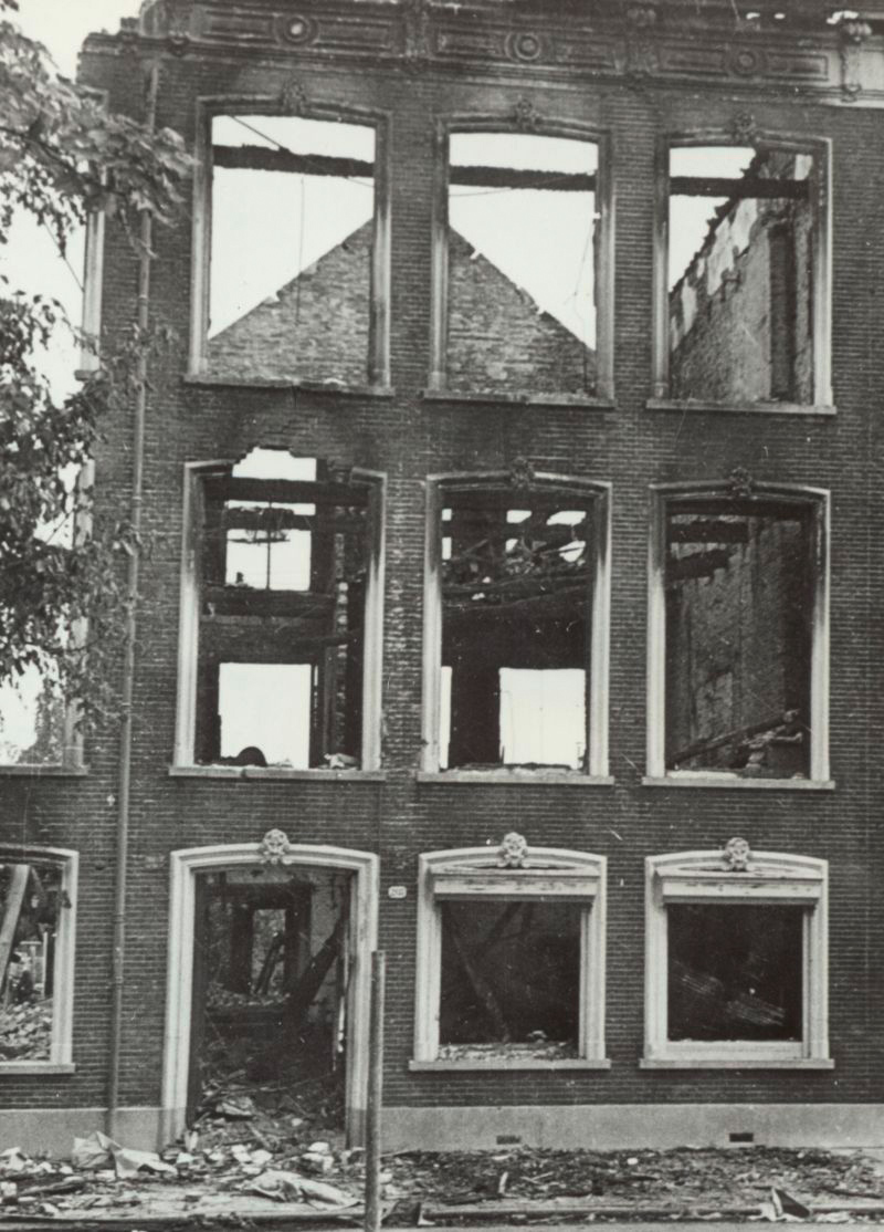 Oorlogsschade aan de Singel nummers 201-209 ten gevolge van de gevechten in mei 1940 tussen Nederlandse en Duitse troepen.- meidagen 1940 zie foto: 1183_2137