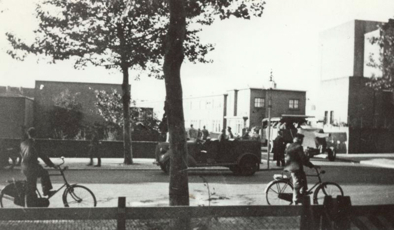 Bosboom-Toussaintstraat met inkijk Betje Wolffstraat, rechts de Torenschool. Militair voertuig, vrachtwaden met manschappen en getrokken kanon.