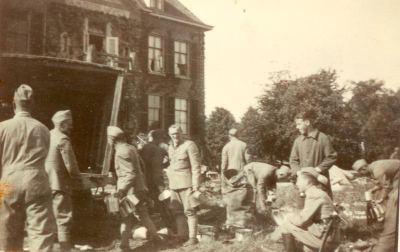Nederlandse militairen, vermoedelijk van I-28 RI bij Amstelwijck in mei 1940. Links is waar de commandopost gevestigd was. Deze foto lijkt na de strijd genomen te zijn. Zie foto : 1183_2145