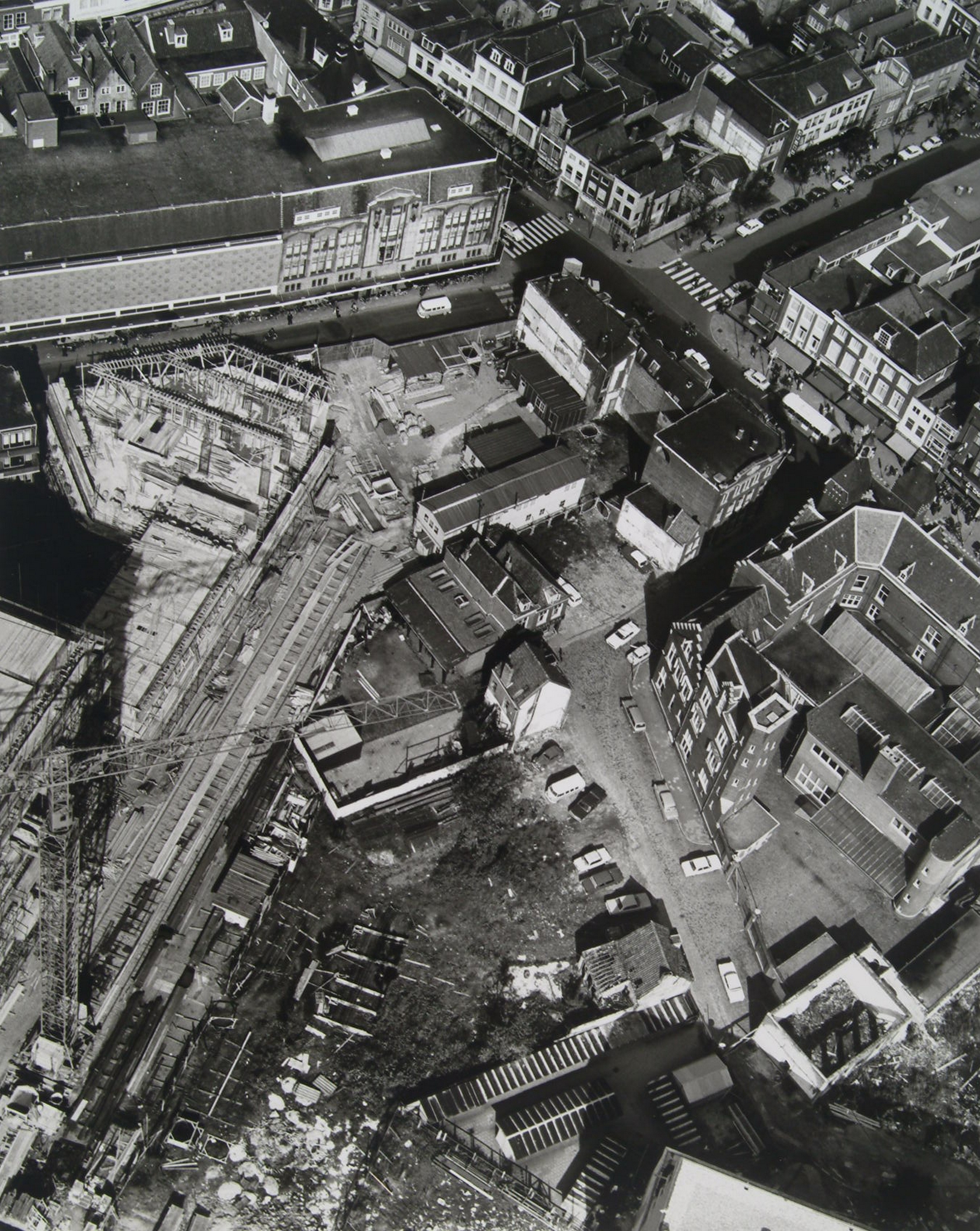 - Luchtfoto van het gebied rond Bagijnhof, Achterom, Sarisgang. Rechts het postkantoor aan het Bagijnhof, links nieuwbouw, centraal het Achterom, boven Raamstraat