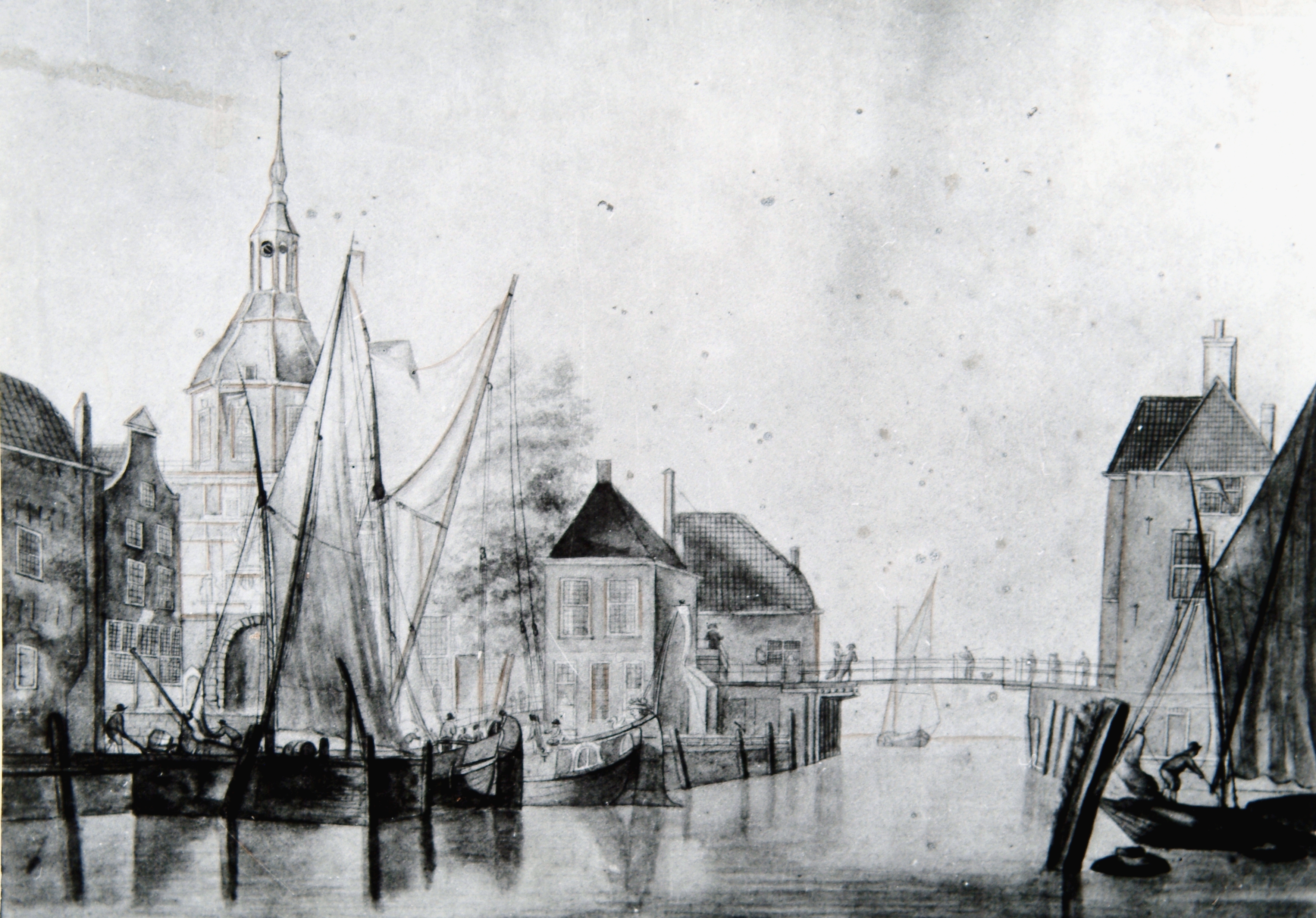- De Wijnhaven bij de Boombrug, waar de haven in de rivier uitmondt. Links de Groothoofdspoort.