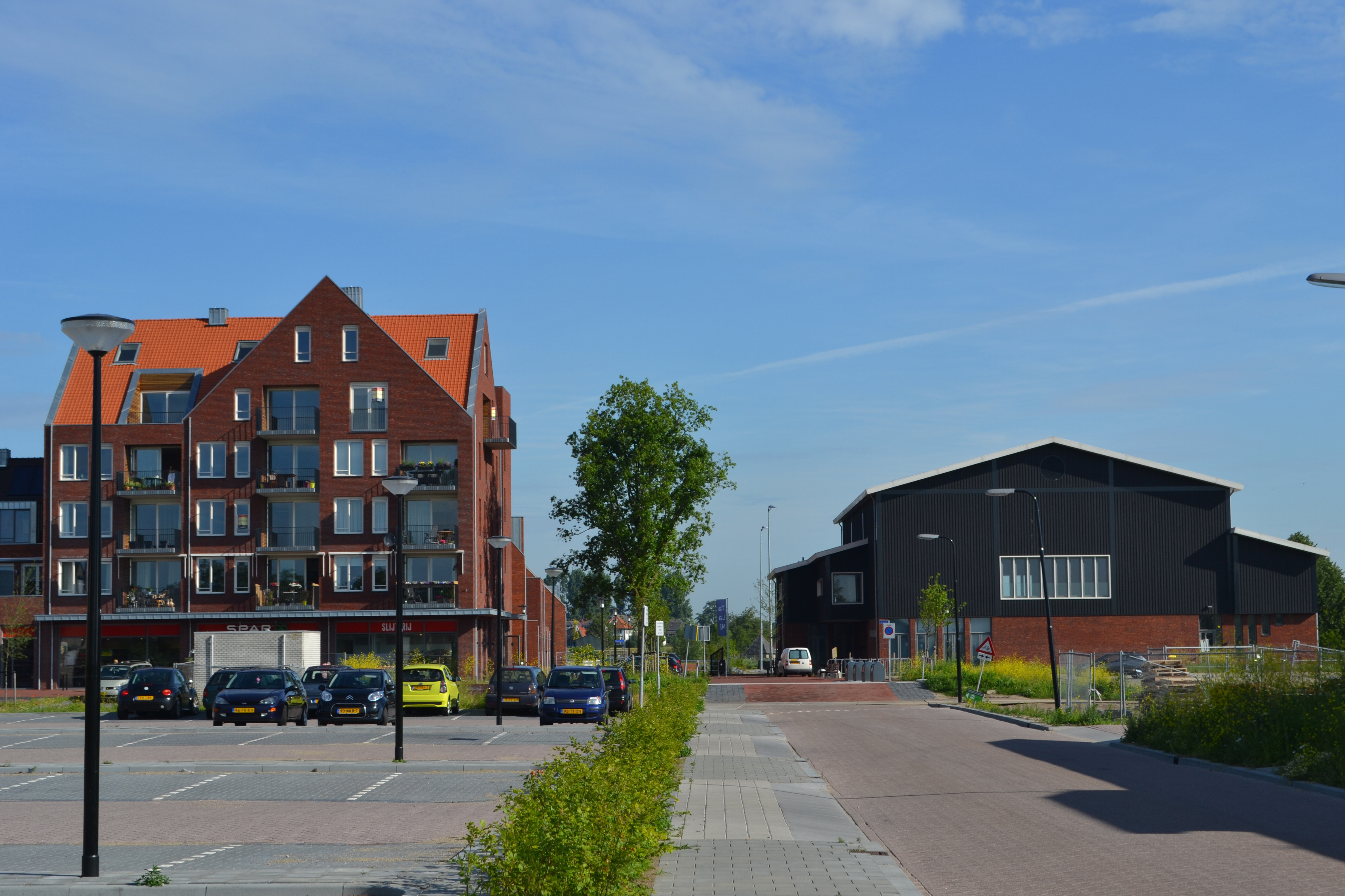 Links Winkelgalerij aan de Waterlinie in Nieuwpoort. rechts sporthal De Poortzicht aan de Waterlinie 3 in Nieuwpoort/Langerak.Gezien vanaf de Tiendweg.