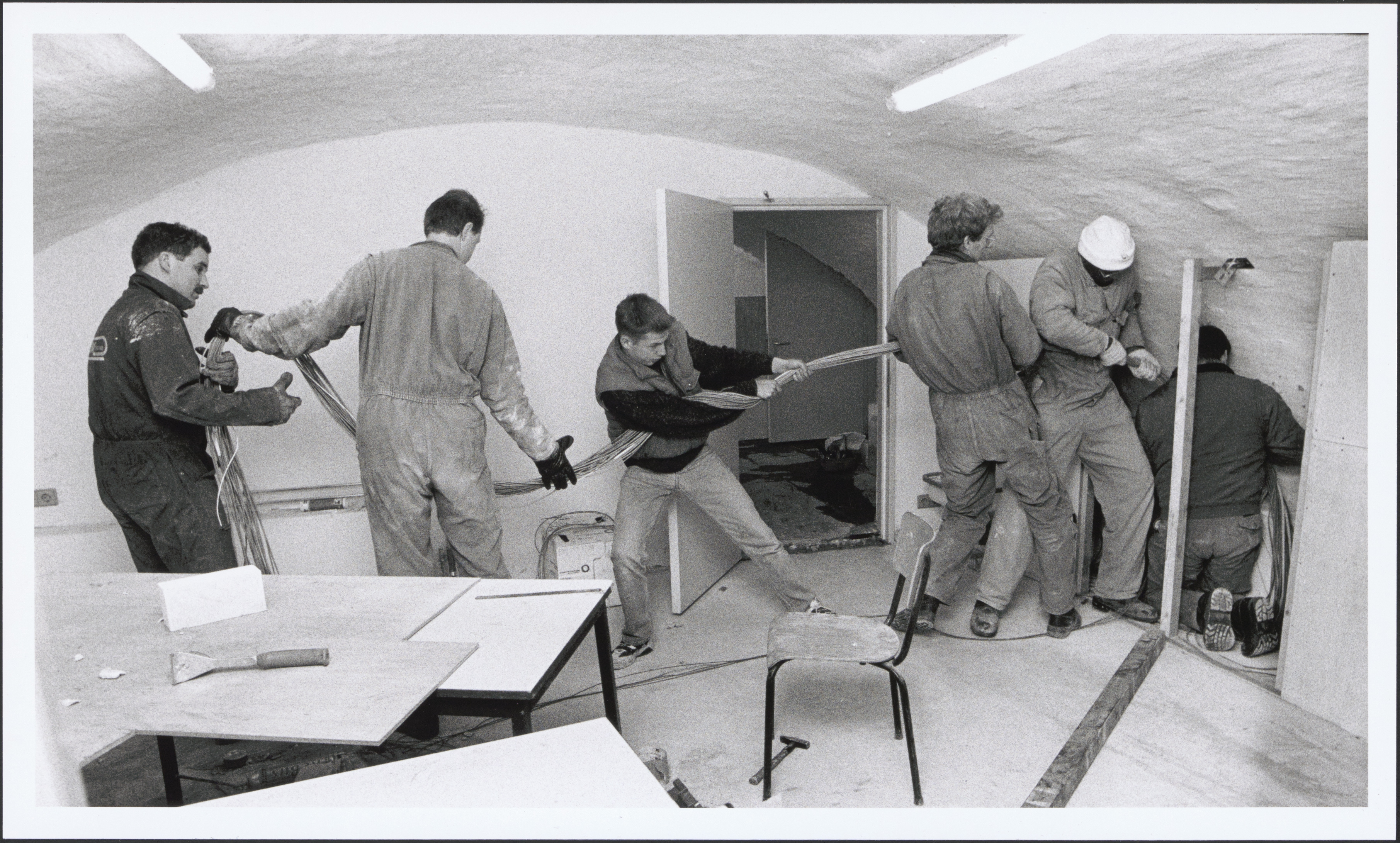 - Trekken van bekabeling tijdens de restauratie van de kelder van de Berckepoort in de Nieuwstraat.