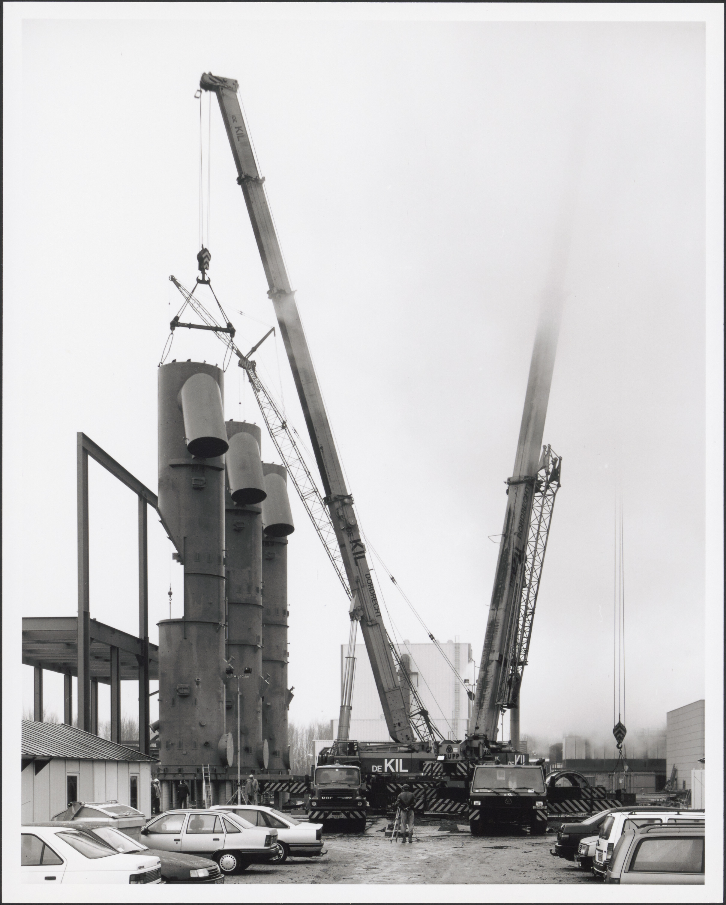 Het is hier voor de mannen oppassen geblazen. Een krappe ruimte waar 3 kranen aan het werk zijn. Kraanbedrijf De Kil heeft net de derde wervelbedoven op zijn sokkel geplaatst. Onderaan de foto staat links naast de KRUPP telescoopkraan de bijzondere DAF N 2800 van kraanbedrijf De Kil.
