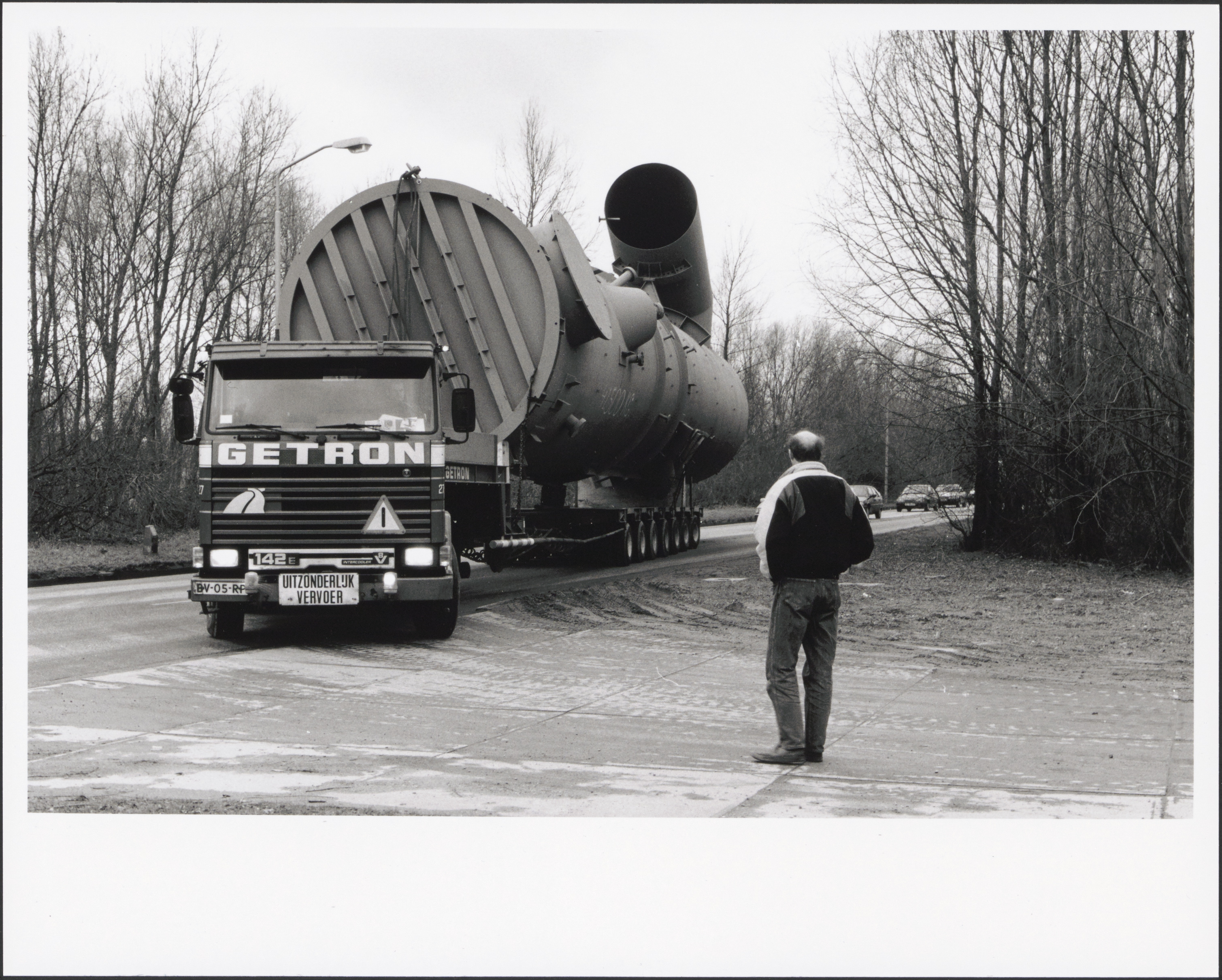 Behoedzaam rijdt de chauffeur zijn combinatie vanaf de Baanhoekweg het bouwterrein op. De 25 m lange en 41 ton wegende wervelbedoven ligt op een Broshuis 7 assige semi-dieplader. Als trekker fungeert een SCANIA 142E, een zwaar chassis geschikt gemaakt voor het trekken van zware lasten. De transporteur, GETRON uit Spijkenisse, maakt graag gebruik van de kracht van de V8-motor van 14 liter. Het onmiskenbare geluid van SCANIA's V8-motor is een legende bij chauffeurs. Het eerste gedeelte van de reis ging over water. Zie afbeelding 1280_1225 en 1253