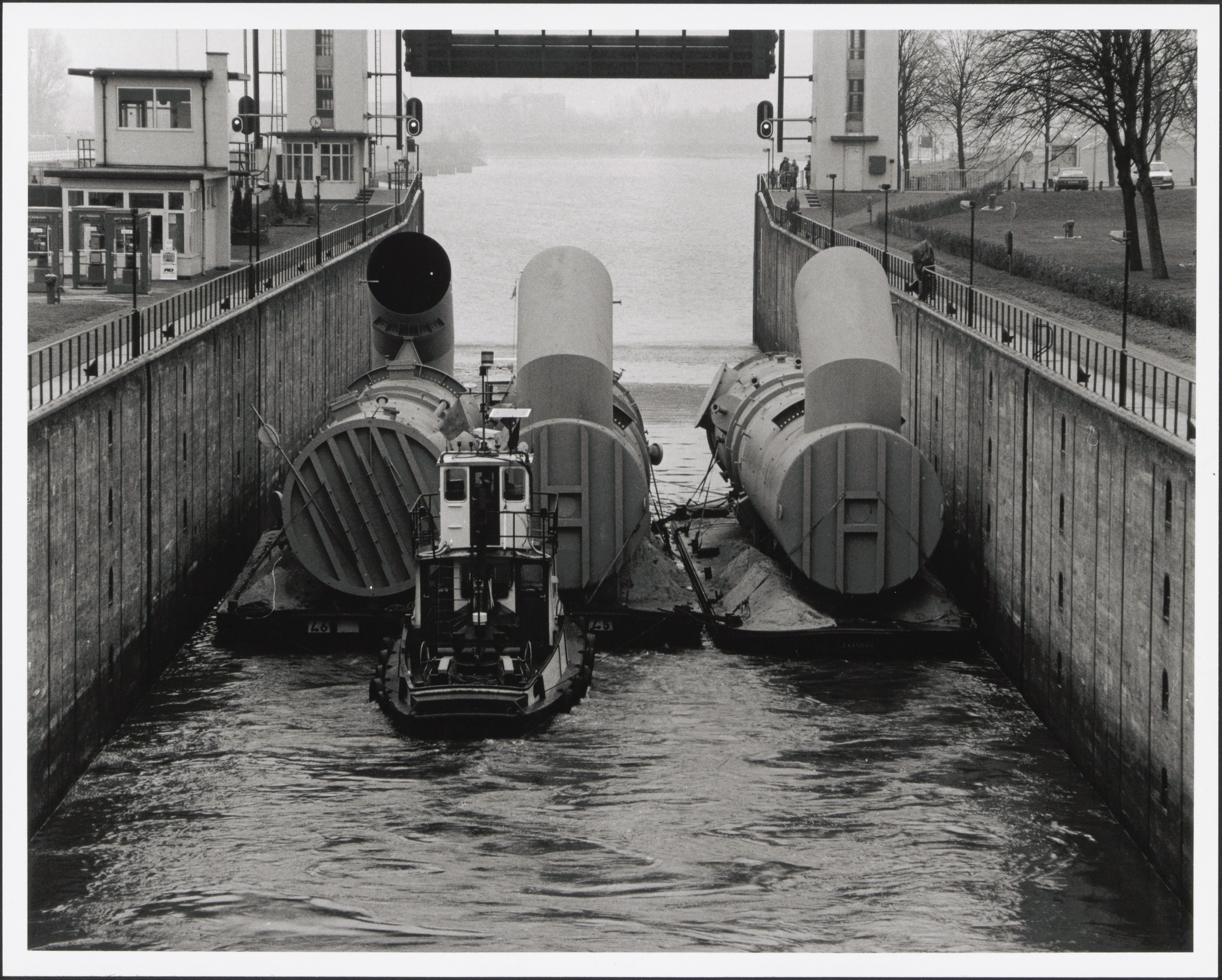 - Wervelbedovens op pontons passeren de Prinses Beatrixsluis in het Lekkanaal in Nieuwegein. Ze zijn op weg naar de in aanbouw zijnde slibverbrandingsinstallatie aan de Baanhoekweg in Dordrecht.