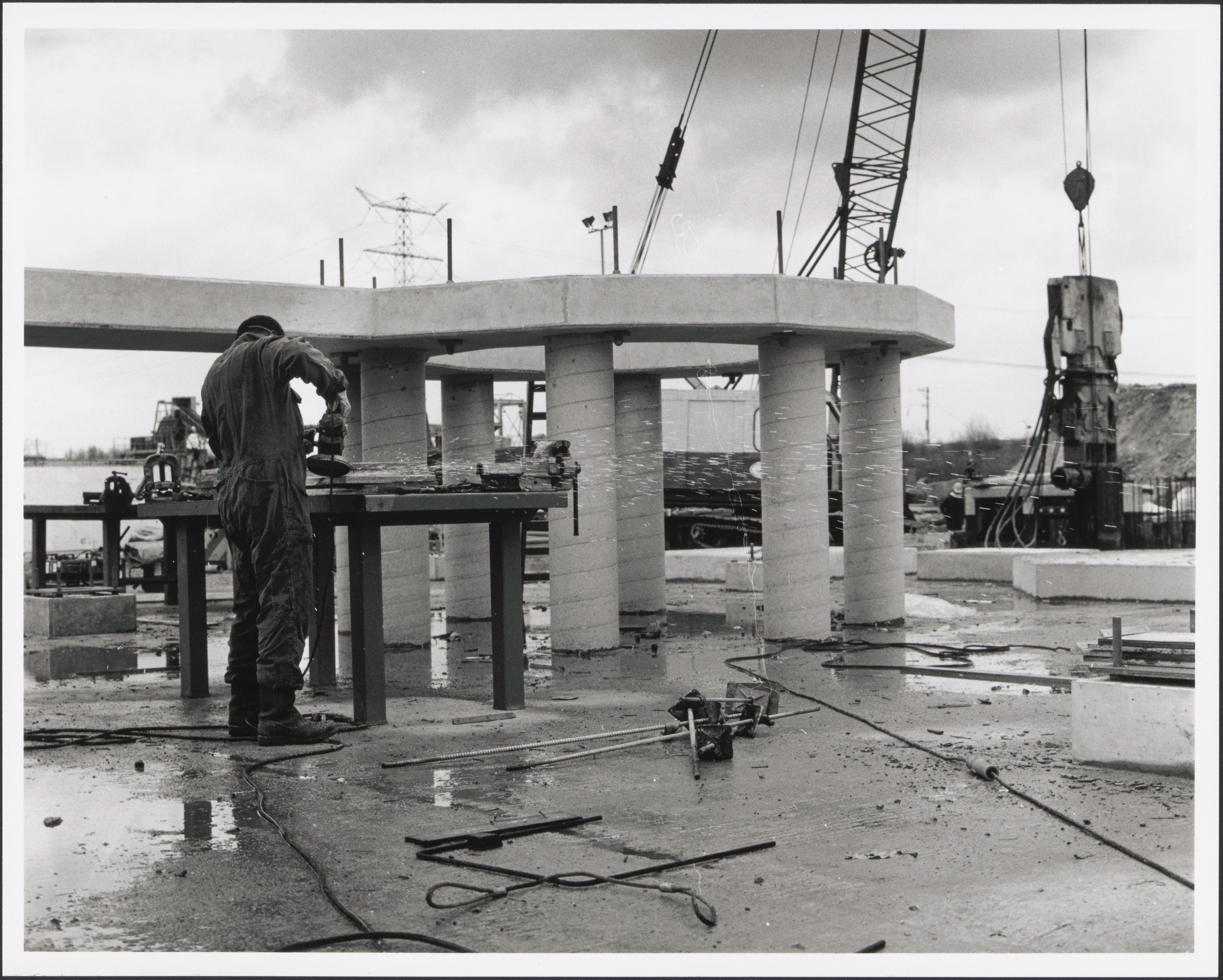 - Bouw van een sokkel voor de verbrandingsoven in slibverbrandingsinstallatie aan de Baanhoekweg. Rechts wordt de damwand verwijderd.