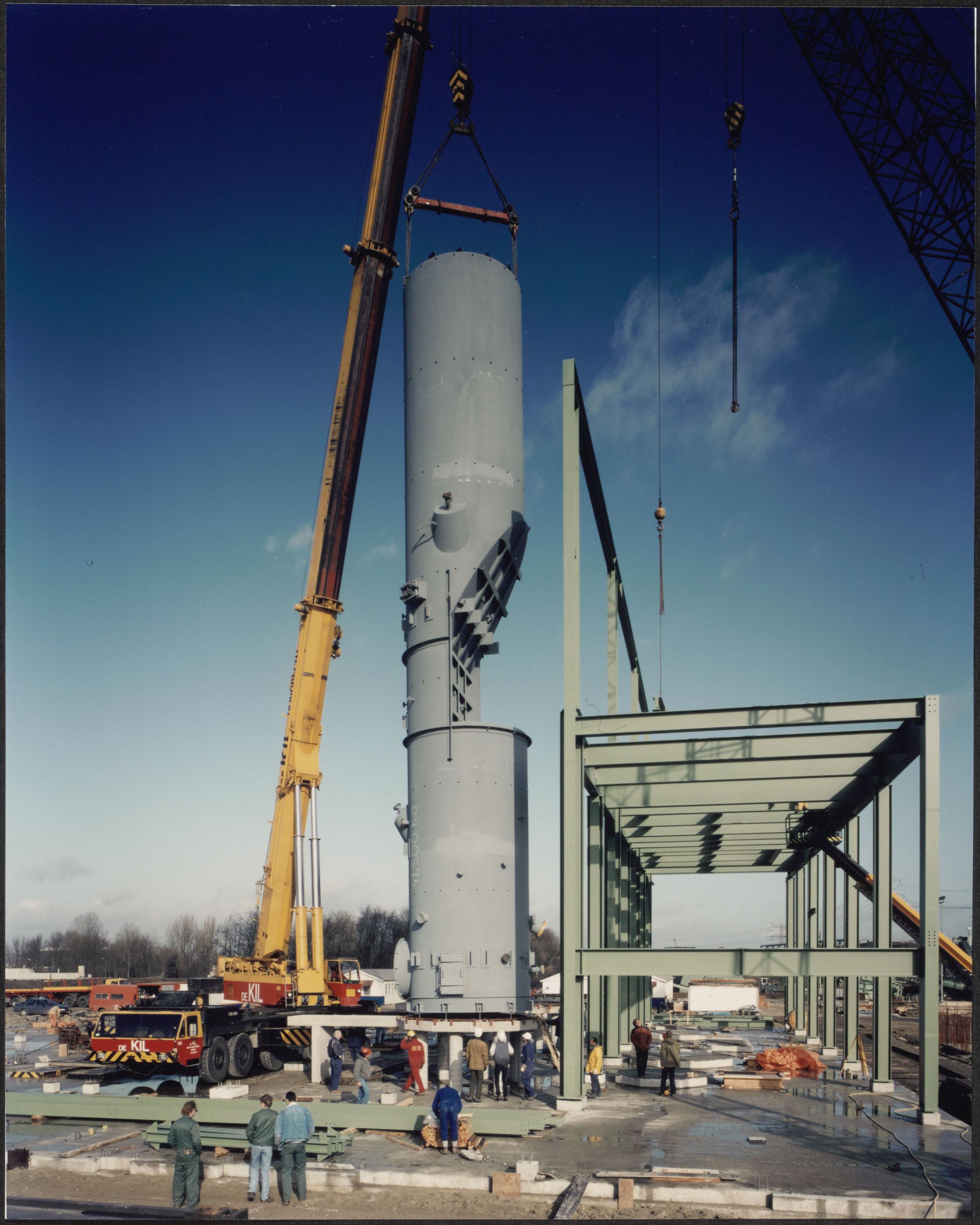 - Plaatsen van een wervelbedoven op een sokkel tijdens de bouw van de slibverbrandingsinstallatie aan de Baanhoekweg.