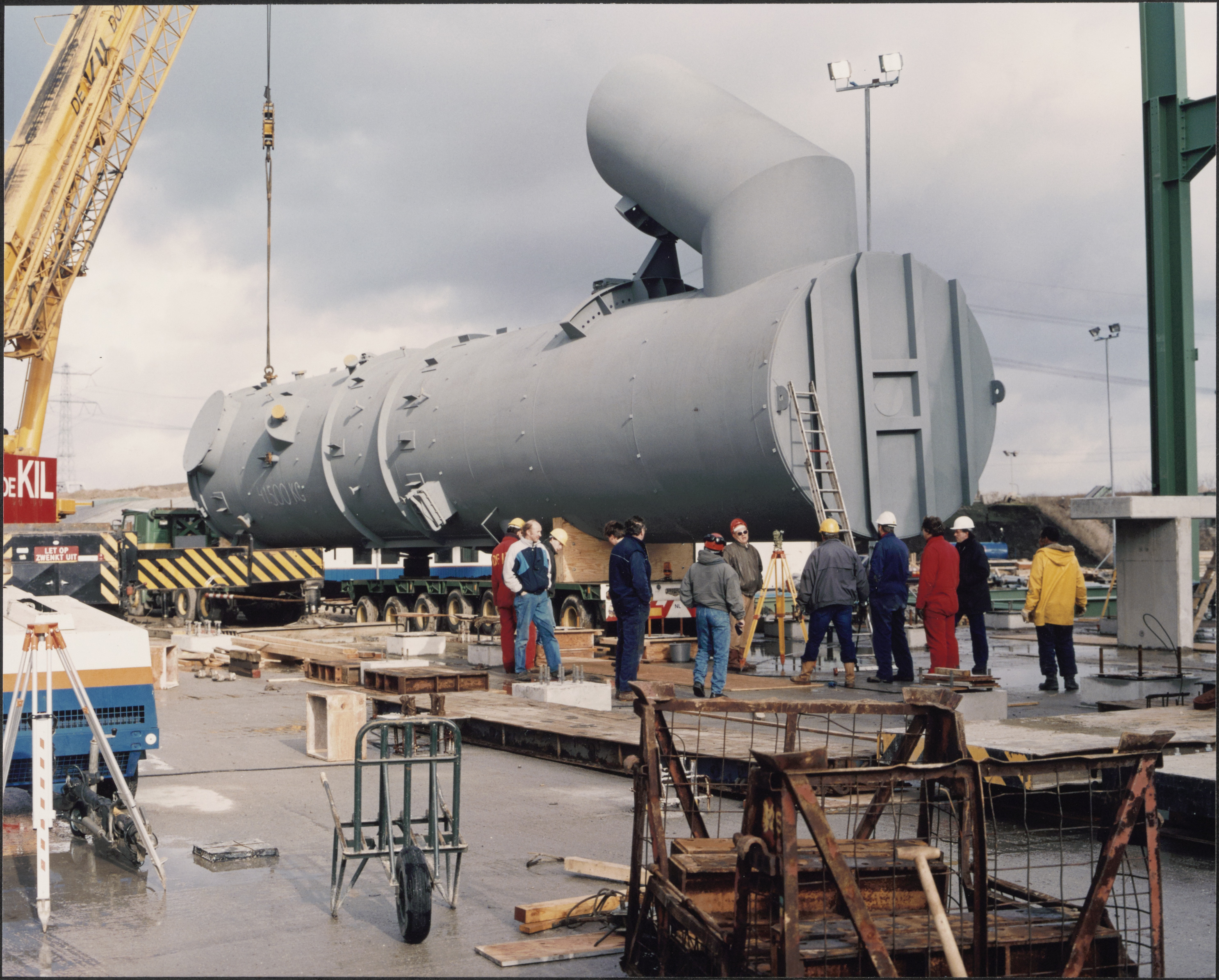 Overlegmoment met veel betrokkenen. De 41 ton zware wervelbedoven, die nog in zijn horizontale transportstand op de trailer ligt, kan weldra opgehesen worden om verticaal op zijn sokkel geplaatst te worden zie 1280_1224.