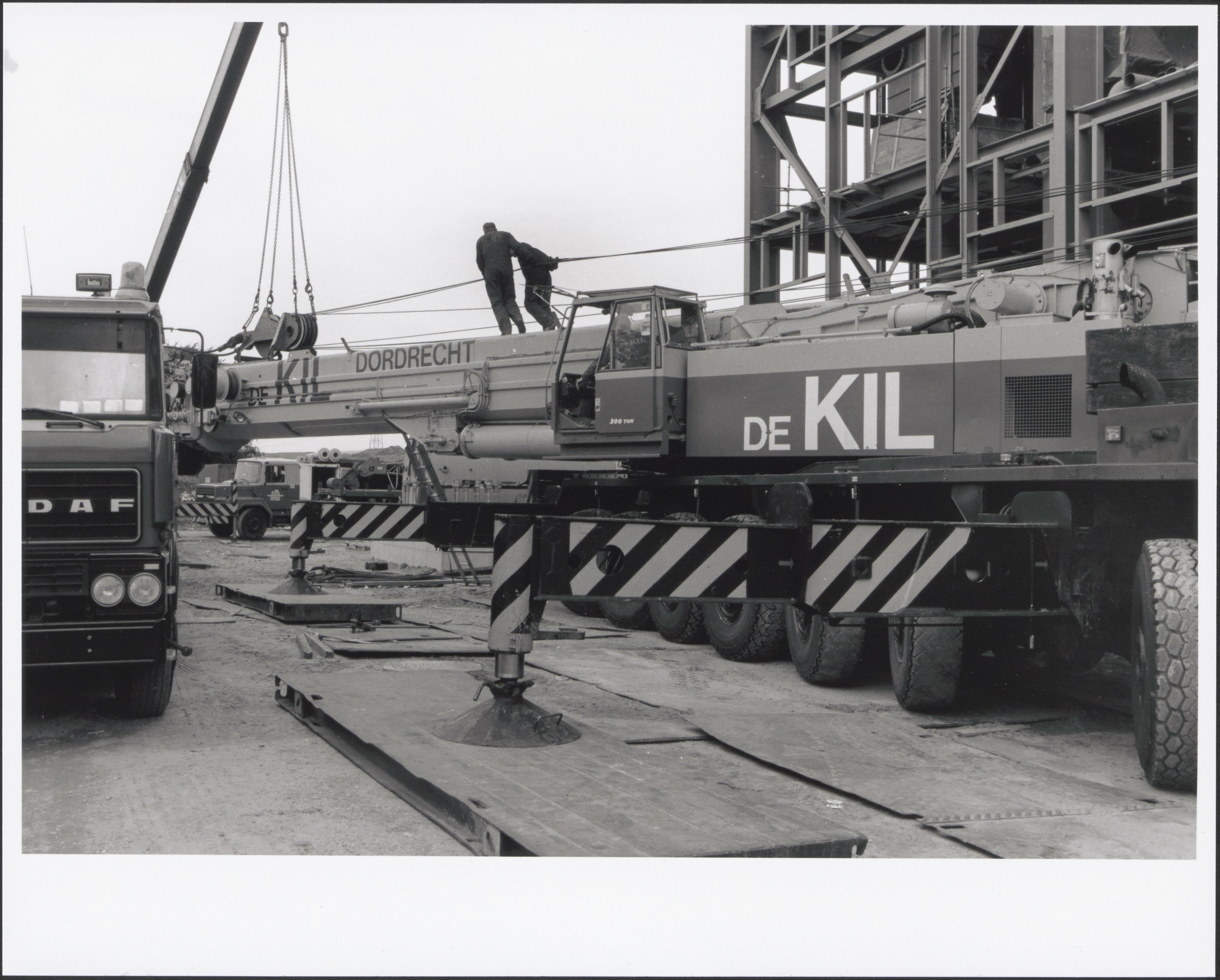 Hoogwerker bij de bouw van de slibverbrandingsinstallatie aan de Baanhoekweg.