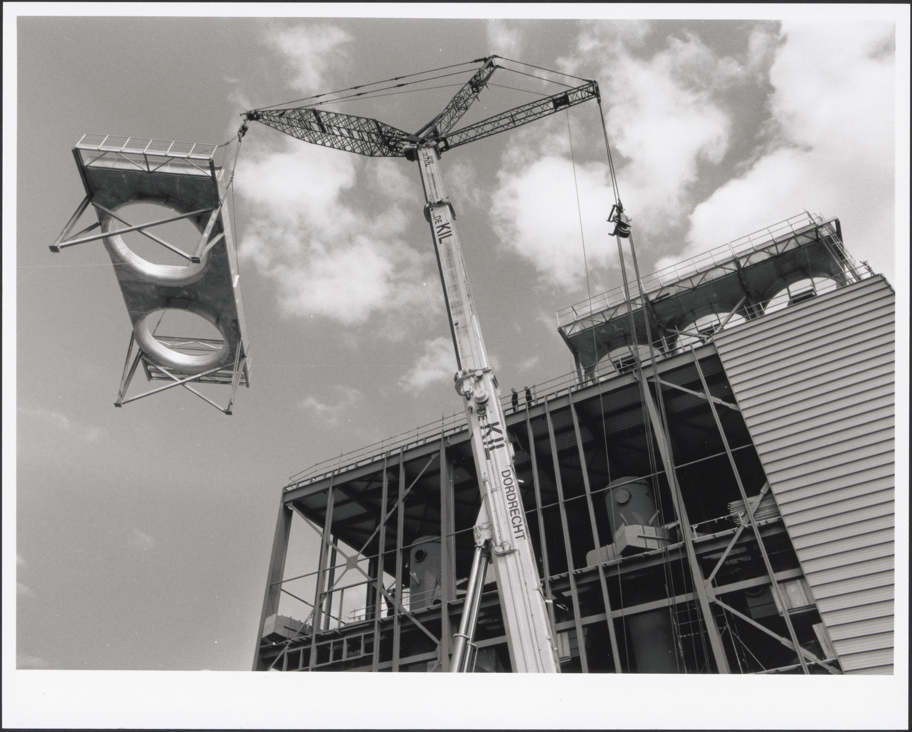 - Onderdelen van de koelinstallatie worden op het dak van de in aanbouw zijnde slibverbrandingsinstallatie aan de Baanhoekweg gehesen.