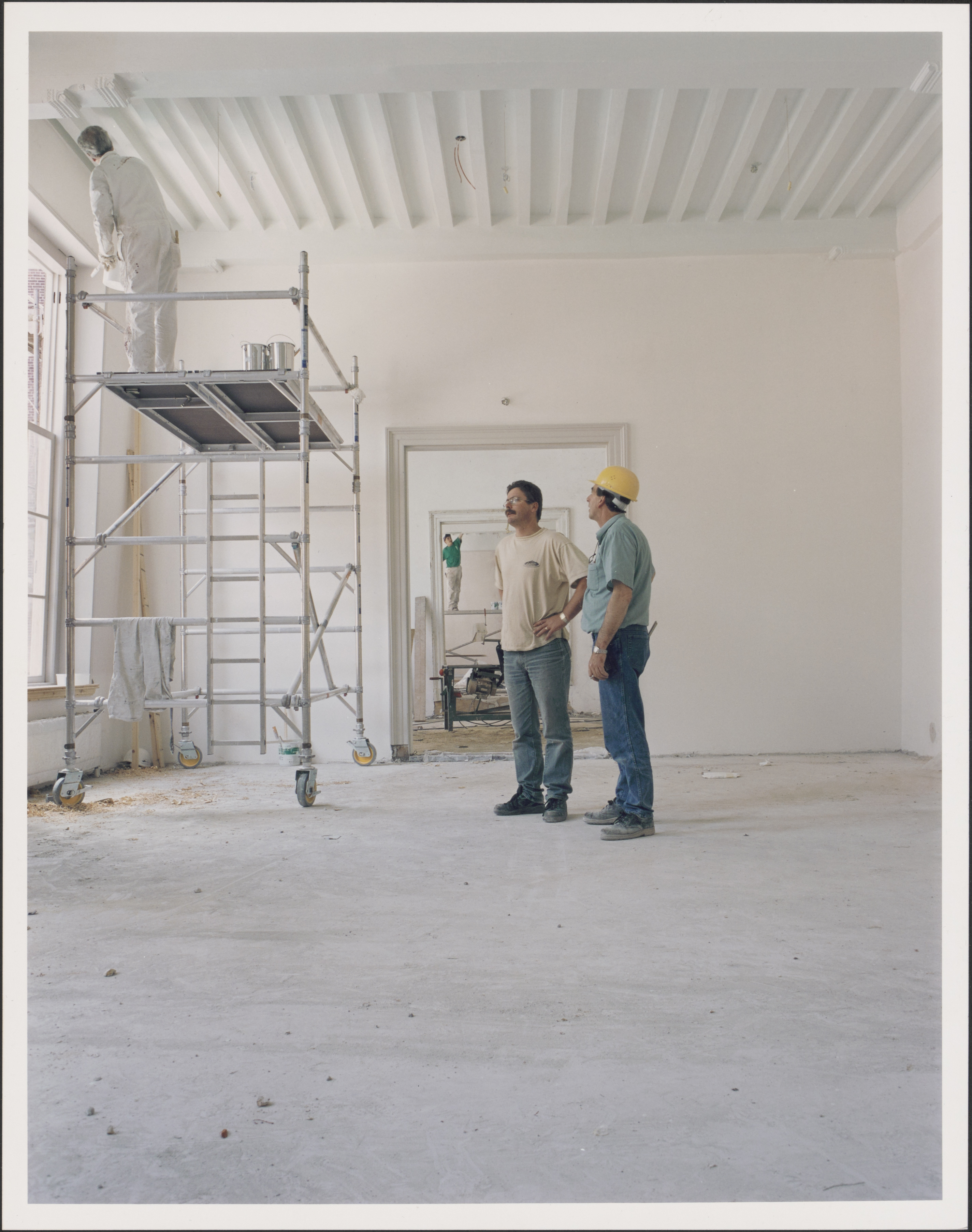 Uitvoerders van bouwbedrijf RNO kijken naar de restauratie van het unieke 16e eeuwse leem-stucplafond door Duitse specialisten, wat op zich al 350.000 gulden kostte in 1996. Zie ook 552_307407. Uniek in Nederland!