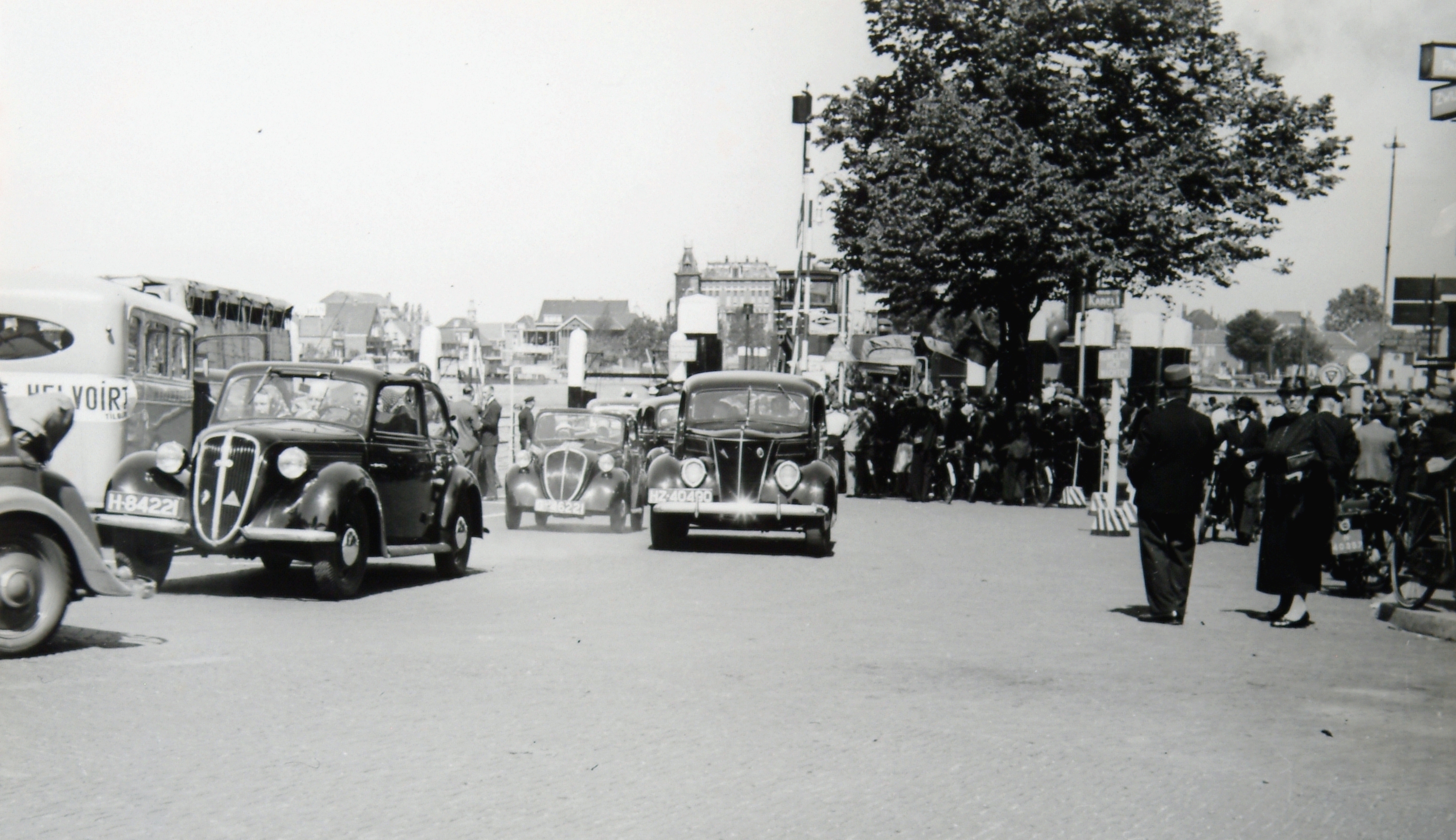 - Pinksterdrukte, auto's en fietsers bij de pont aan het Blauwpoortsplein.
