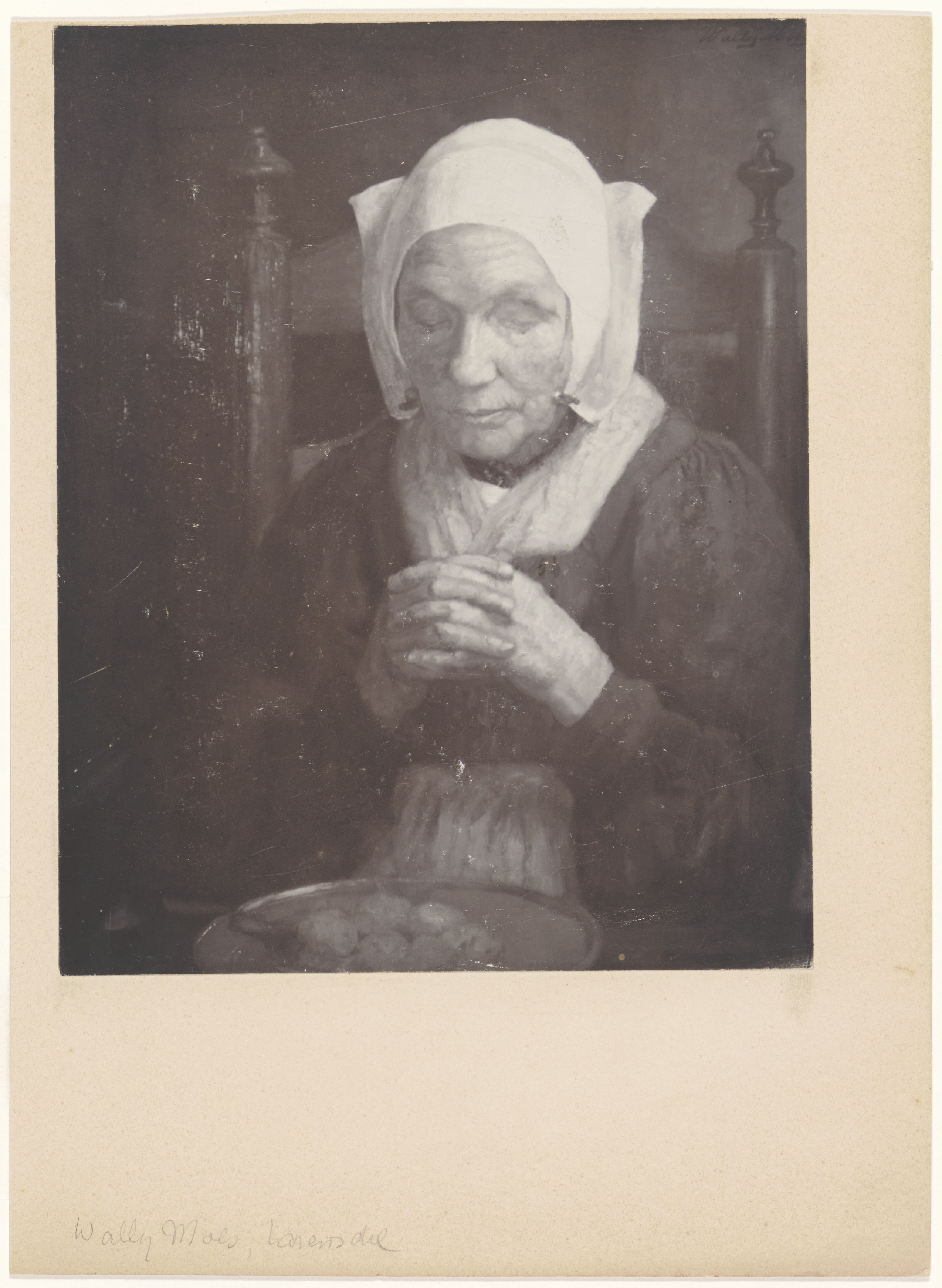 Foto van een tekening van Wally Moes van een zittende vrouw in klederdracht