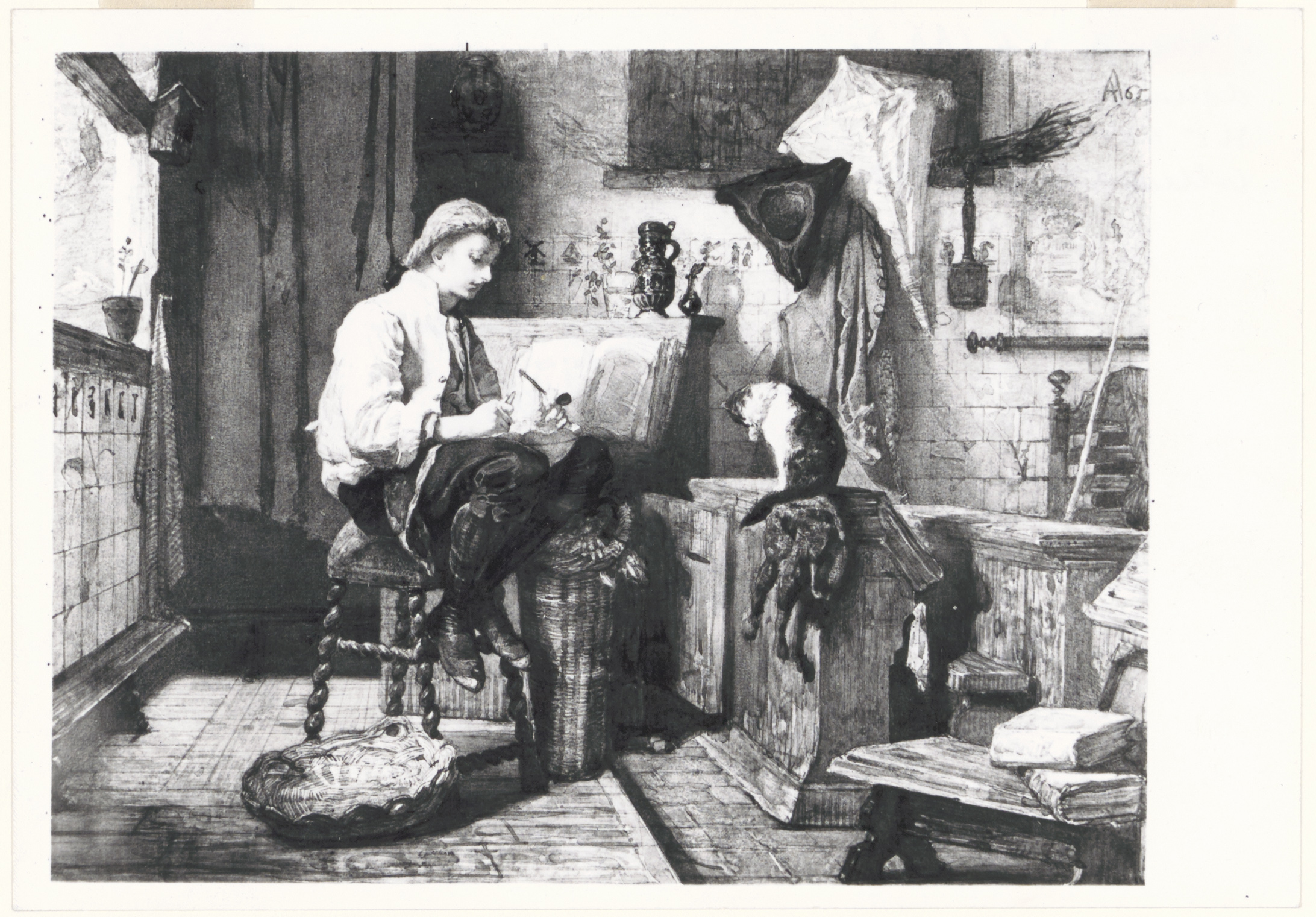 Prent getekend door August Allebé van een huiselijk tafereel van een jongen met een kat