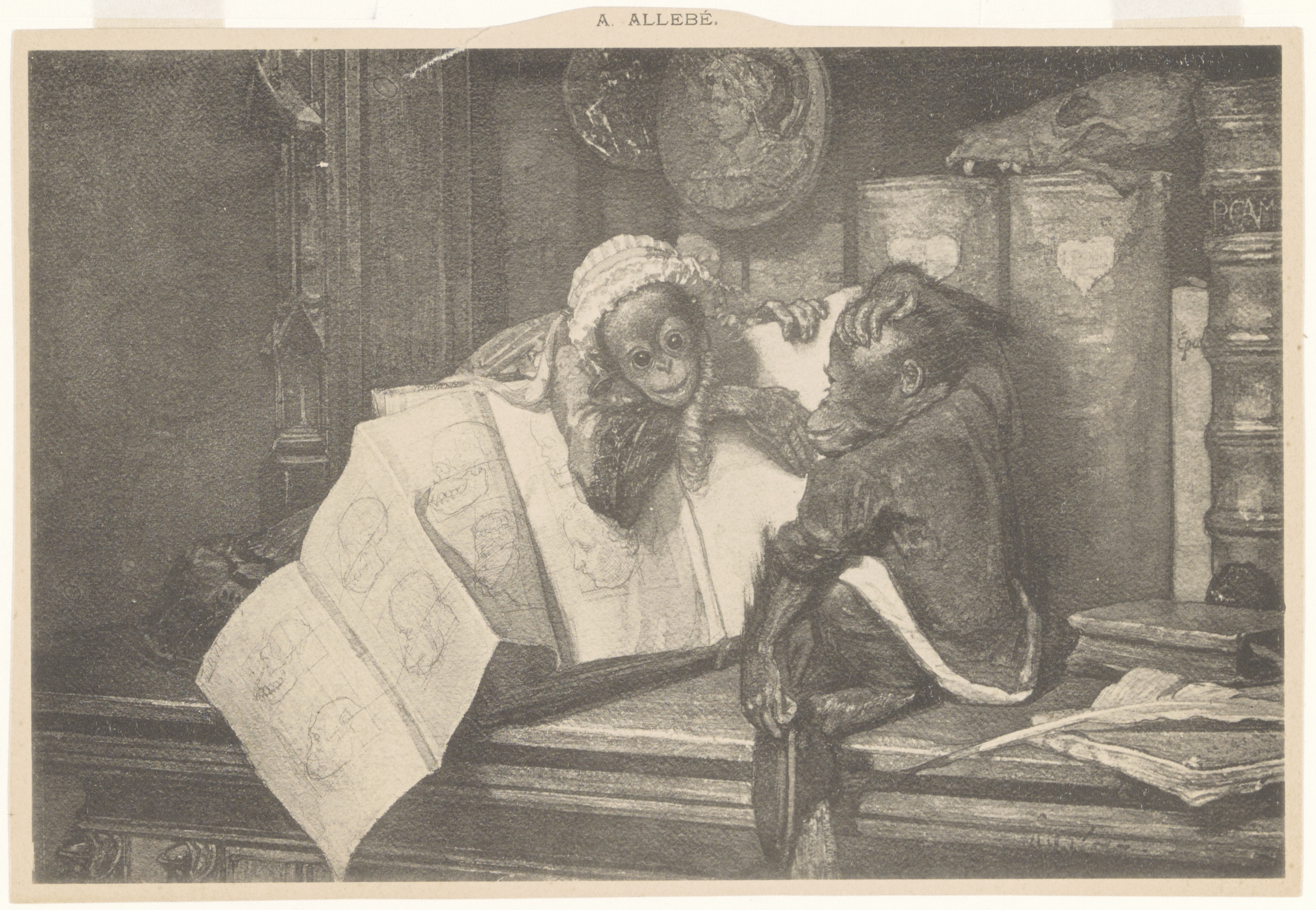 August Allebé - aapjes in boekenkast (tekening)