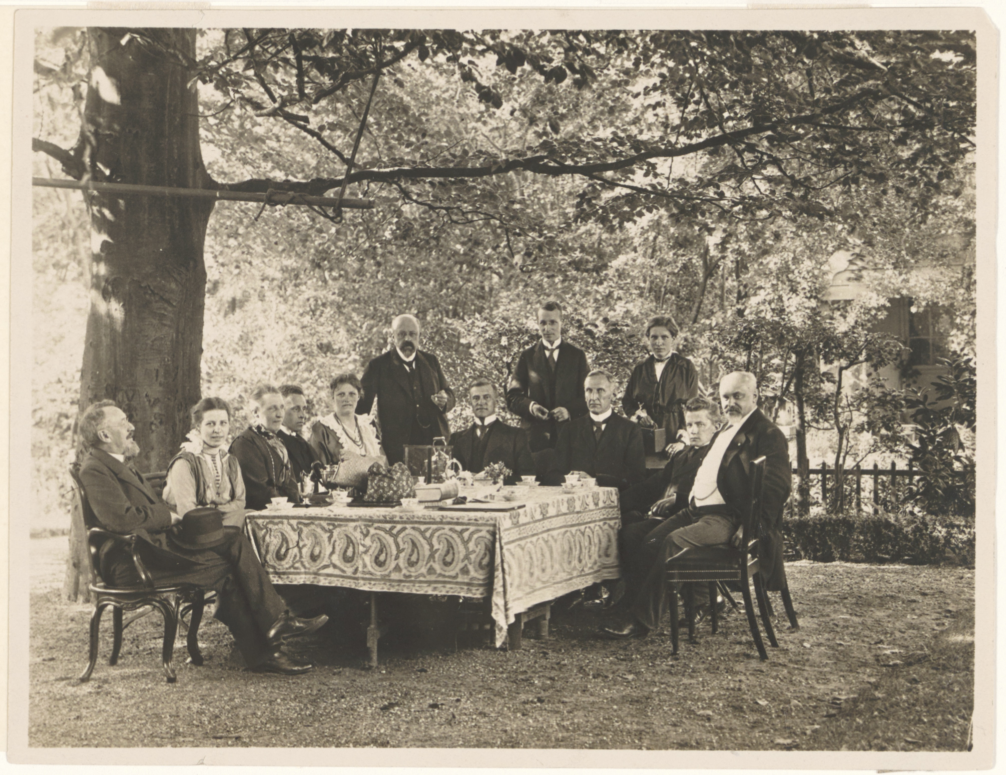- Foto van leden van de families Veth, Delprat, De Hoop Scheffer en Moes tijdens een maaltijd in de tuin